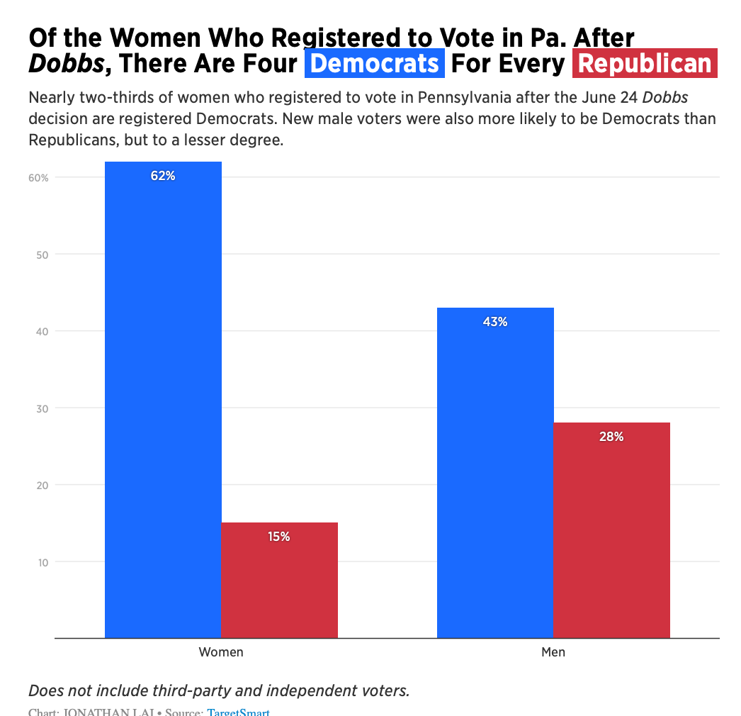 Pennsylvania: As we noted earlier this month, women have significantly outpaced men in new voter registrations in swing states since the Supreme Court nuked abortion rights. A further dive into the data by the Philadelphia Inquirer indicates that the trend is only growing more pronounced: