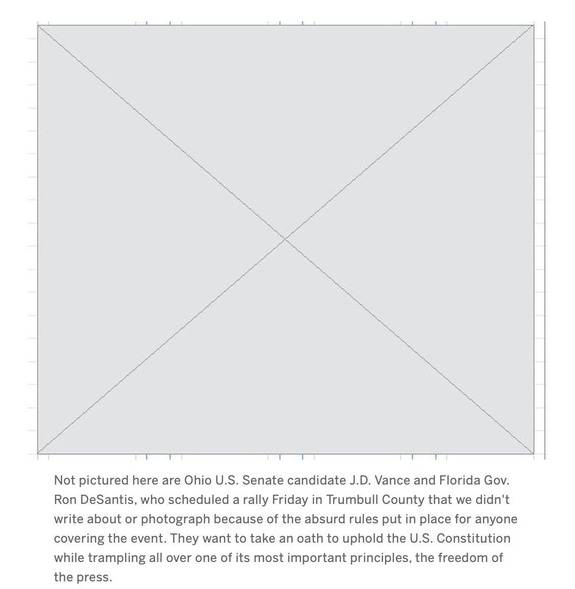 Local and regional newspapers, sick of the dictatorial schtick, are beginning to refuse to play ball with the Florida strongman. On Tuesday, the Cleveland Plain Dealer pushed back against the demands by not only refusing to cover an event featuring DeSantis and JD Vance, but also publishing a letter from the editor explaining why they were holding out alongside a big blank box where a photo would usually run.