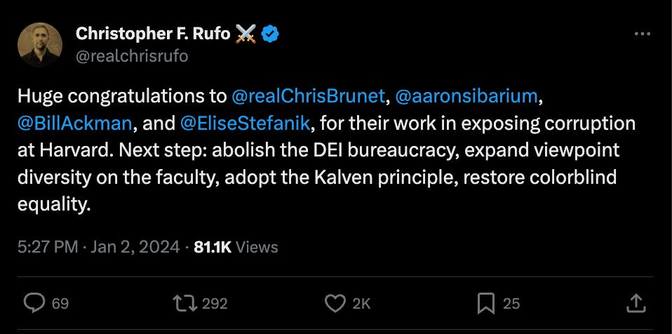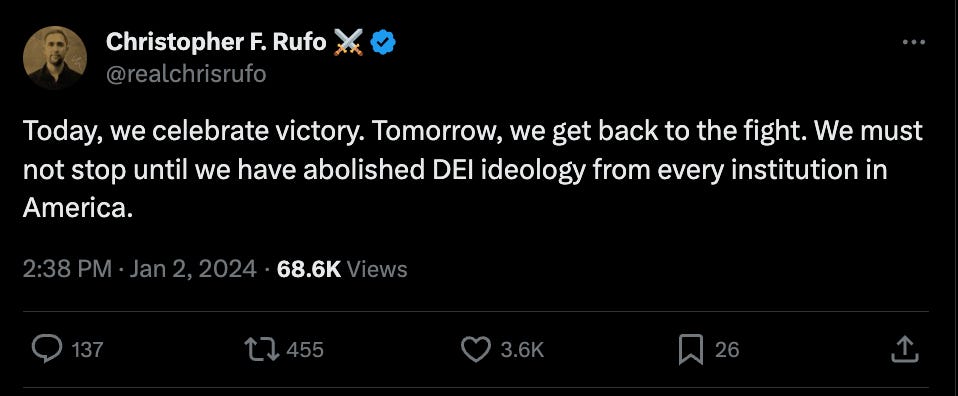 Gay did make mistakes in citing sources, though they were far more technical than academically dishonest. Rufo, no stranger to bad faith arguments, wasn’t interested in appended corrections; instead, he used them to press the case that Gay was unqualified for the job and was only hired to satisfy the demands of the woke mob that he imagines is secretly in control of nearly every college campus in the United States. In his version of events, Gay’s citations were an outrageous scandal that was being covered up by leftist Ivy League heathens so that she could continue to implement DEI initiatives that hurt white people. I wrote a long piece about this affair last month.
