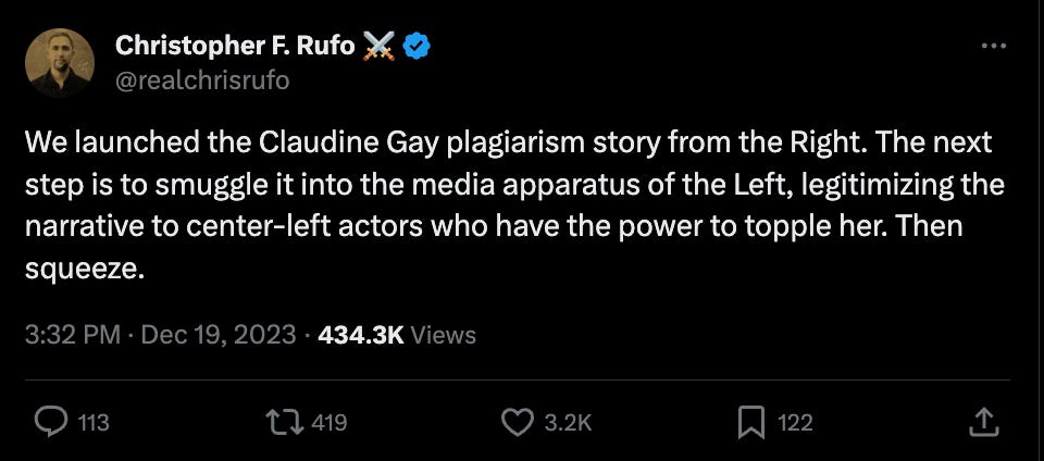 One doesn’t have to defend Gay’s academic work to understand that the attacks had nothing to do with her old papers, nor were they even about antisemitism — she scrambled to institute rather draconian changes on campus to please donors, to no avail. Rufo has always been upfront about his objectives, to the point that he often tweets out his rhetorical game plan and media strategy. He did exactly that during his months-long campaign against Gay, and on Tuesday, his celebratory posts couldn’t have been more blunt.
