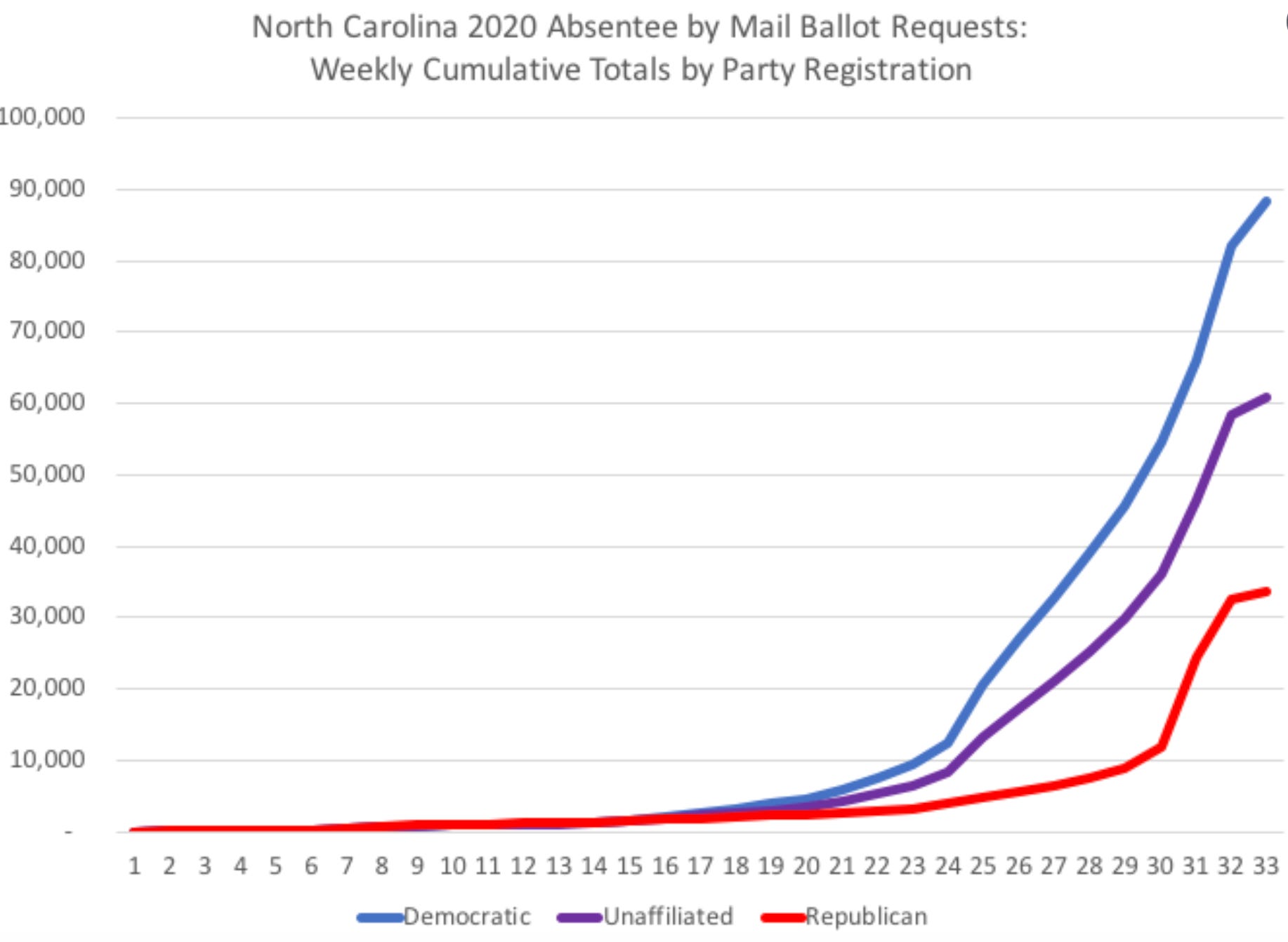 Democrats continue to dominate absentee ballot requests in North Carolina (and yes, the state will have drop boxes). This graph, via Old North State Politics, says it all: