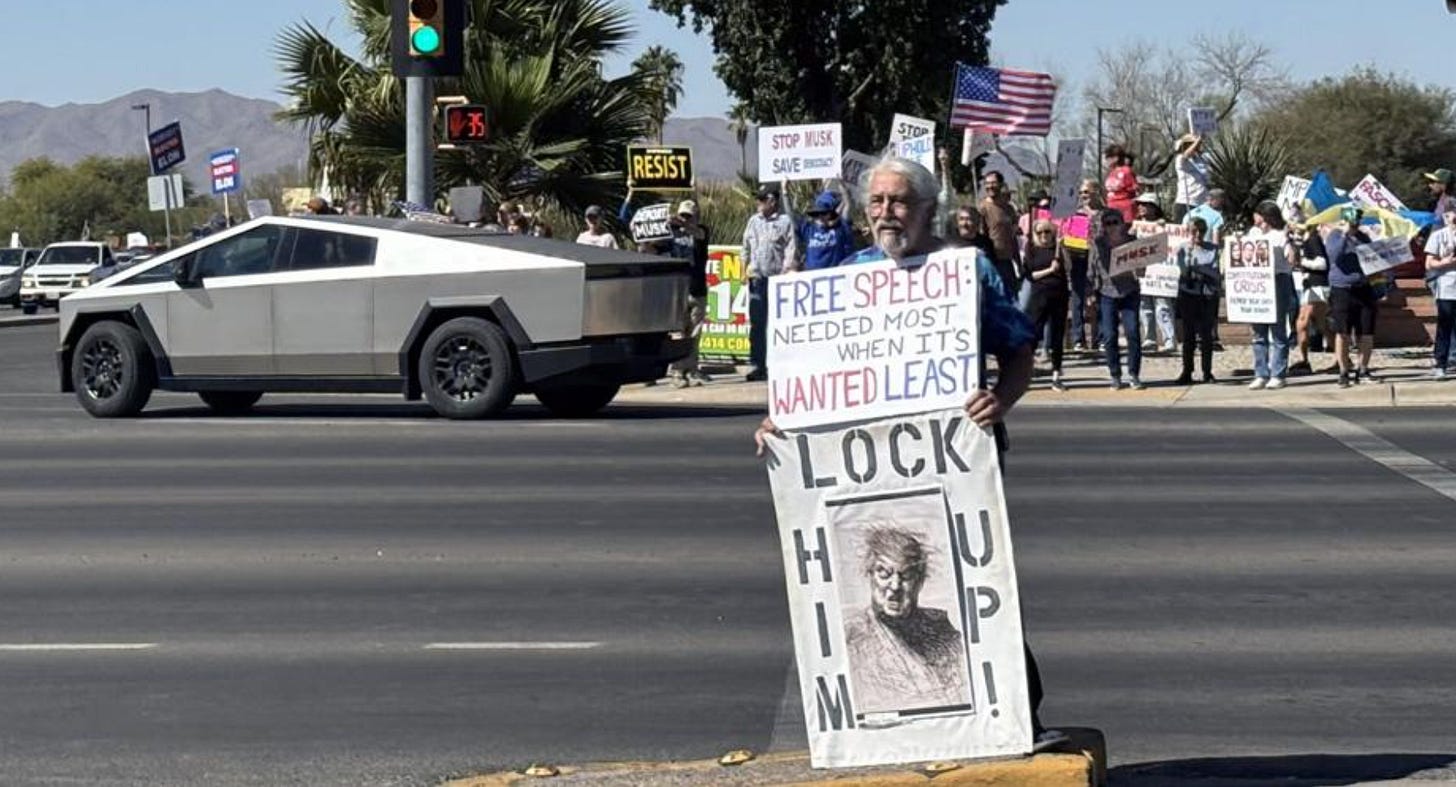 Upward of 1300 people lined the blocks around a Tesla dealership in Tempe, AZ on Saturday to protest Elon Musk, Donald Trump, and their ongoing destruction of the federal government.