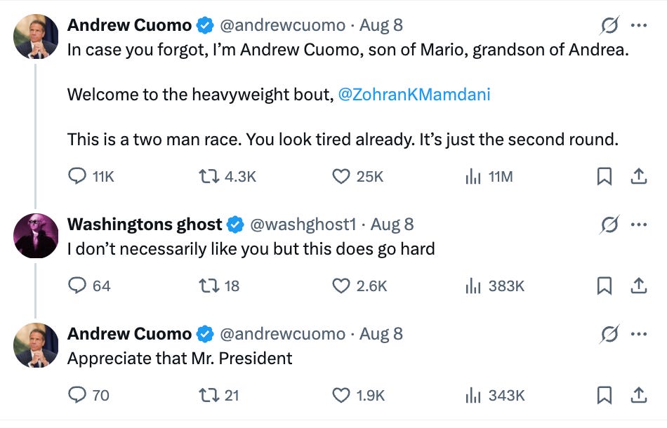 Though he was backed with north of $25 million by the city’s financial elite, who have experienced a very public collective meltdown since his loss in the primary, Cuomo has attempted to recast himself as a pugilistic populist. Don’t get it twisted: Cuomo is still running with modest policy proposals that won’t inconvenience his Super PAC donors. But now, he’s also trying to define Mamdani as an out-of-touch elitist, an approach that has thus far largely just highlighted the former governor’s weaknesses.