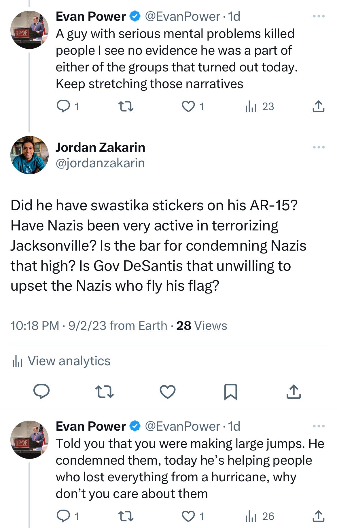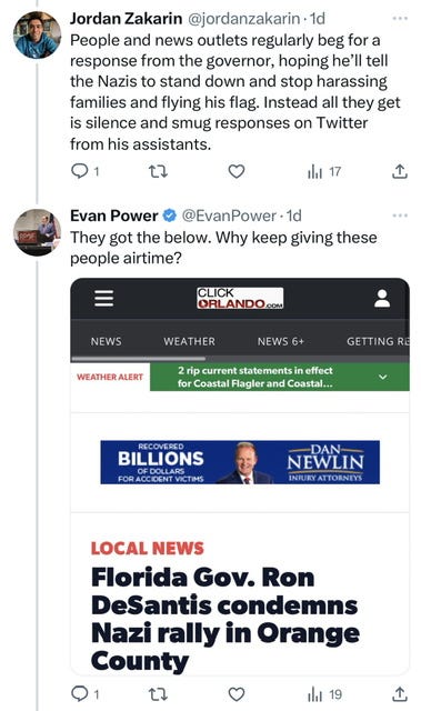A professional DeSantis mouthpiece, Power initially responded to my tweet by suggesting that the neo-Nazi blitz “appears to be a orchestrated event,” propagating the lie that the marches were a hoax perpetrated by Democrats. Not all of the neo-Nazis were DeSantis fanatics, but suggesting they were Democrats was idiotic, irresponsible, and unsurprising.