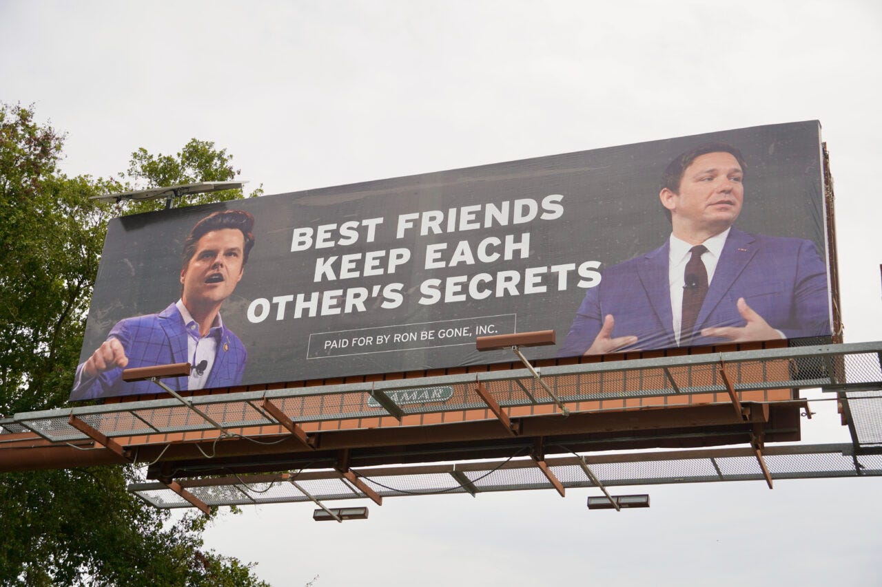 DeSantis should be tied to Matt Gaetz at all times. It won’t hurt him with Republicans, at least not yet, but I can’t imagine it’ll be all that helpful with a general election audience.
