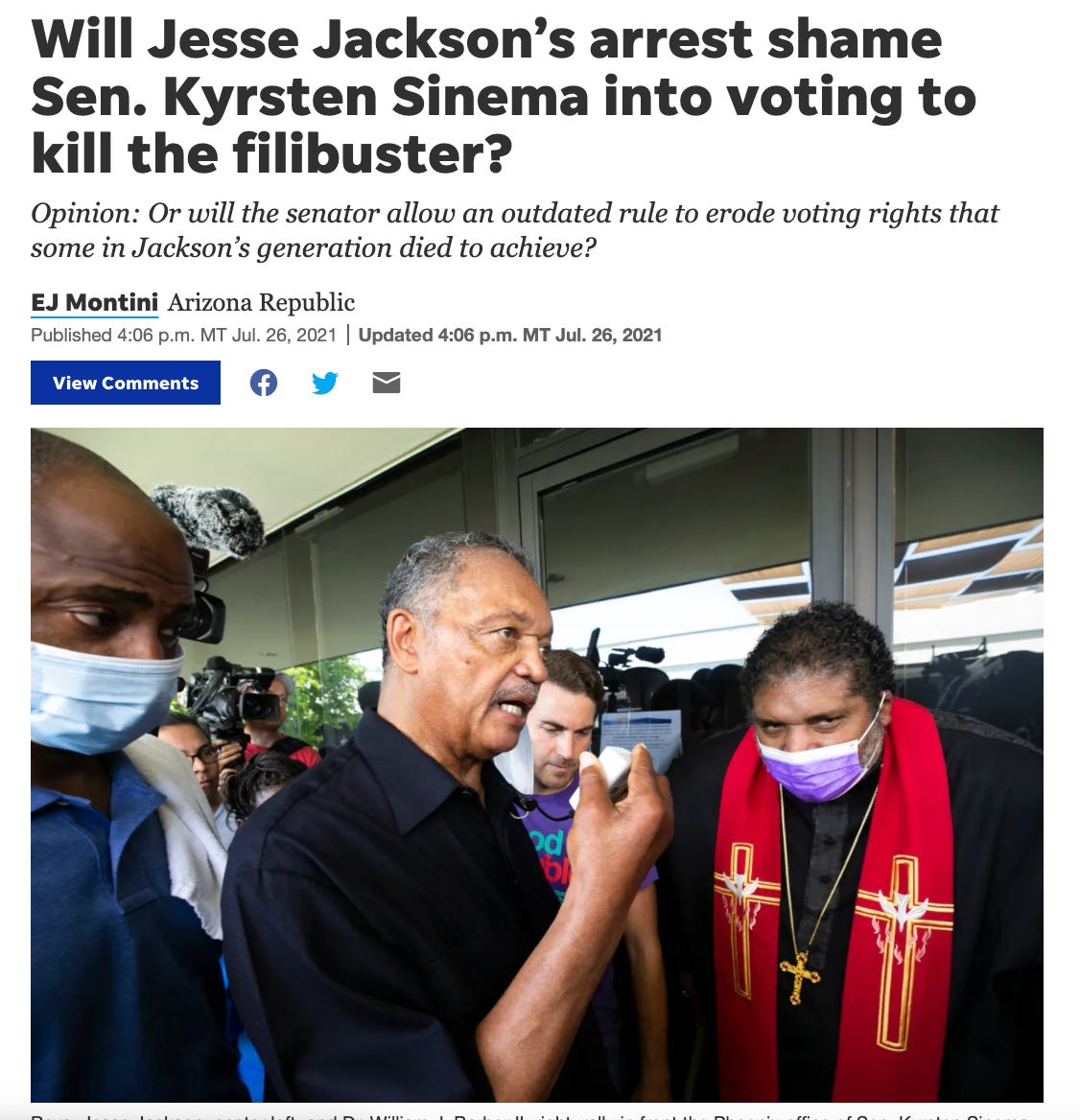 Arizona: And yet, because Democratic lawmakers are entirely unconcerned with what their most ardent supporters think, a 79-year-old, Parkinson’s-stricken Tev. Jesse Jackson had to fly to Arizona and march in the heat in order to demonstrate in front of Kyrsten Sinema’s office. Jackson, Rev. William J. Barber, a handful of state lawmakers, and a number of other civil rights activists were there to demand that Sinema drop her militant defense of the filibuster so that the For The People Act, John Lewis Act, and heretofore unwritten criminal justice reform bill could pass through the deadlocked, useless Senate.