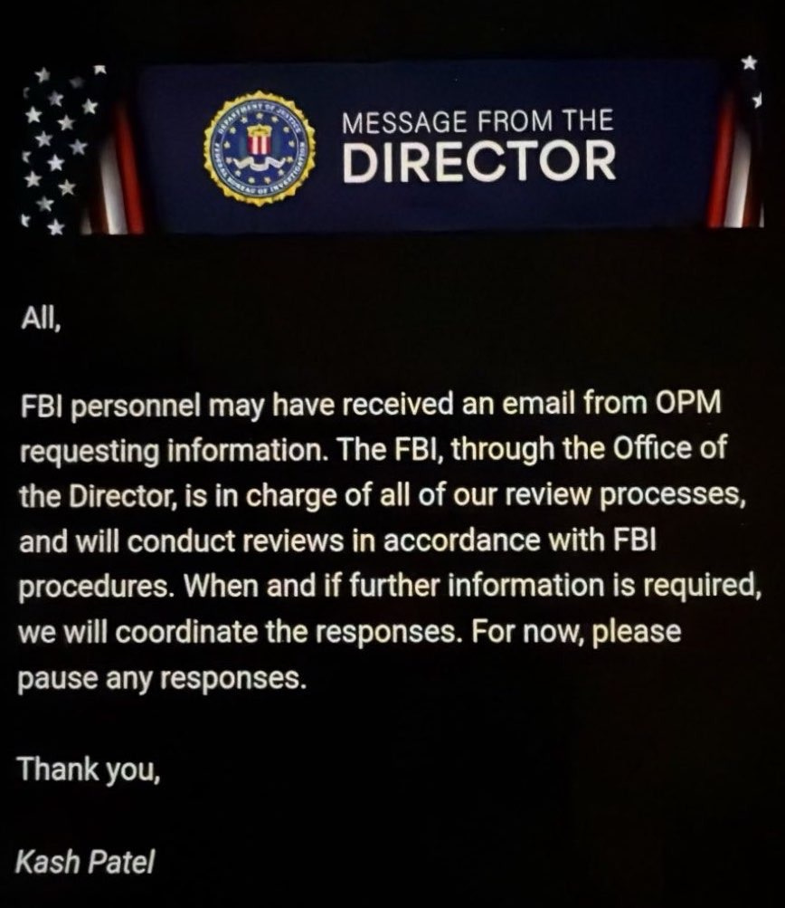 “FBI personnel may have received an email from OPM requesting information, Patel wrote. “The FBI, through the Office of the Director, is in charge of all of our review processes, and will conduct reviews in accordance with FBI procedures. When and if further information is required, we will coordinate the responses. For now, please pause any responses.”