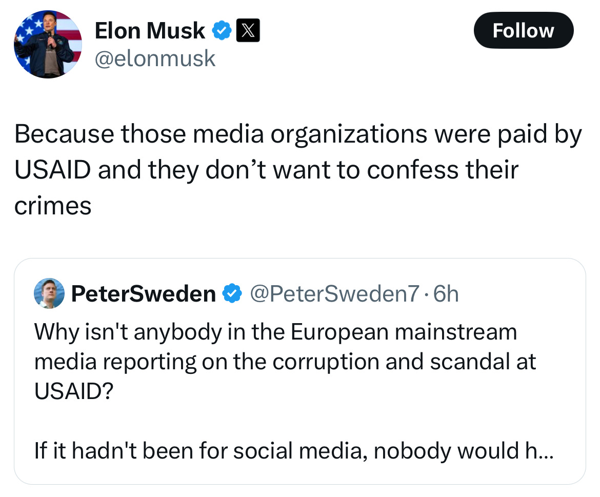 A human truffle pig for narcotics, Musk is very clearly delighting in his newfound power and the pain that he can so freely inflict on so many vulnerable people. Instead of seeking to simply destroy government, as the Heritage right wants to do, Musk wants to automate and weaponize it against regulators and ideological enemies. For both of them, the endgame goes beyond power; they each want to be the unquestioned center of the universe.