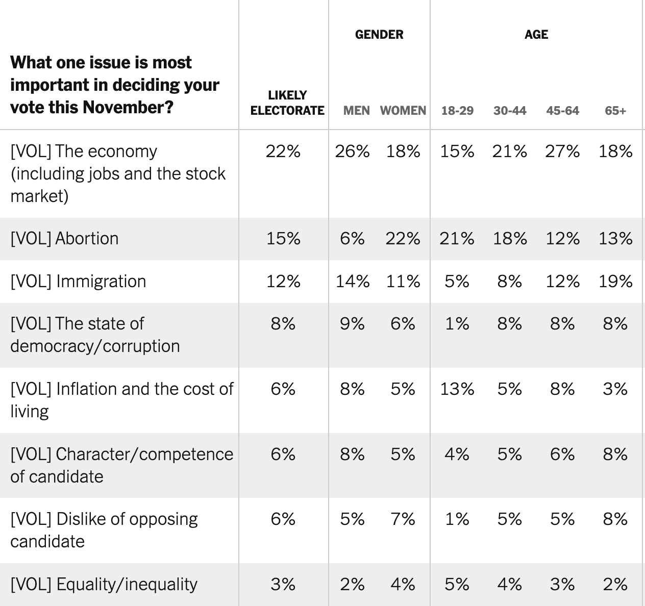The most recent Siena/NYT poll found that 22% of women listed abortion and reproductive rights as their most pressing issue, while just six percent of men put bodily autonomy at the top, even though it should impact them just as much.
