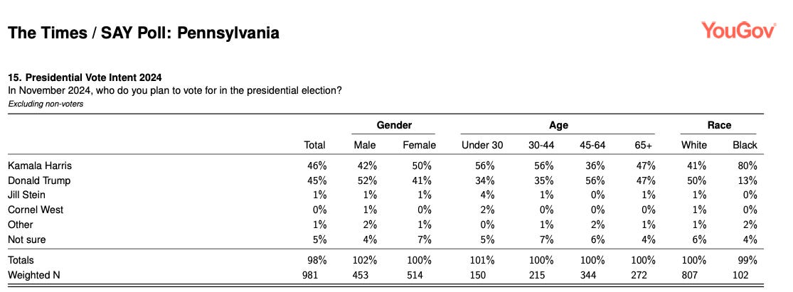 The most recent survey from YouGov, another well-regarded pollster, shows men and women in Pennsylvania with a slightly smaller gap in their preferred candidates; Trump leads among men by 10 points and Harris holds a 9-point lead among women.
