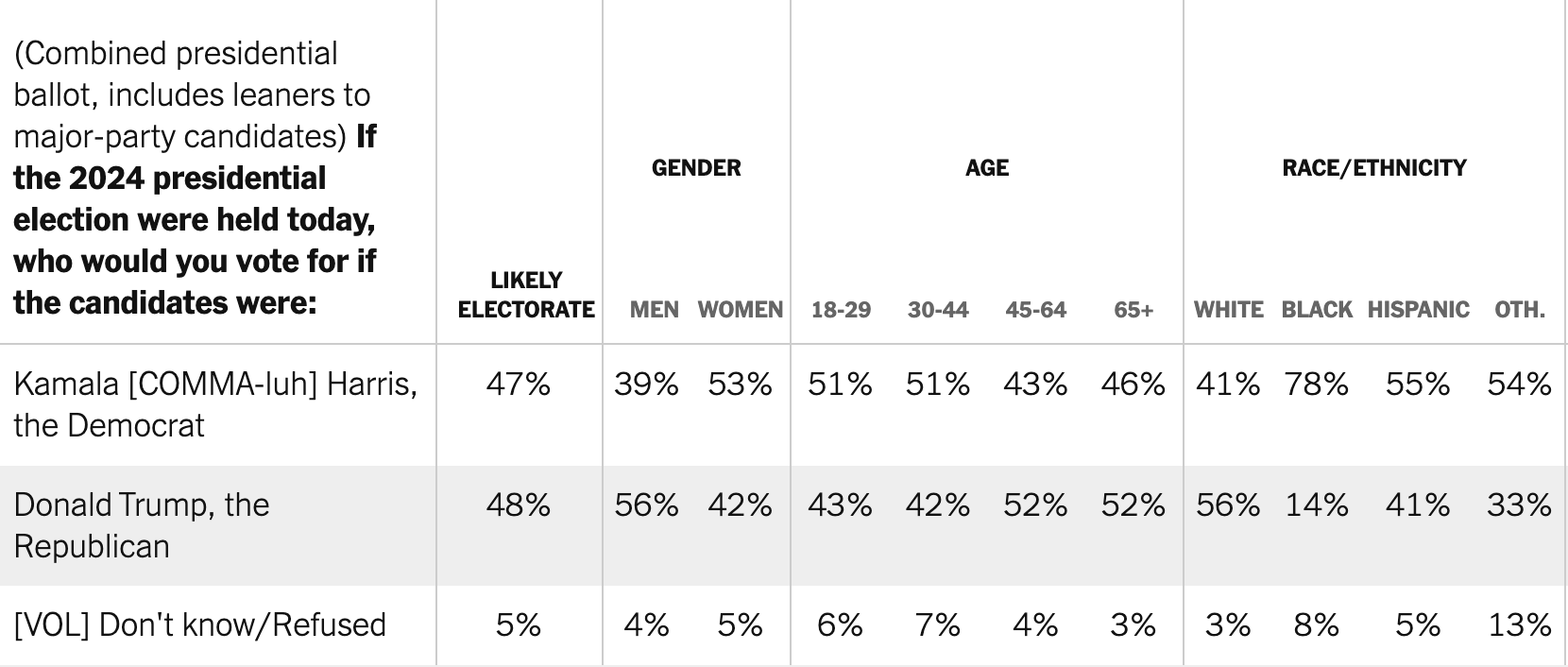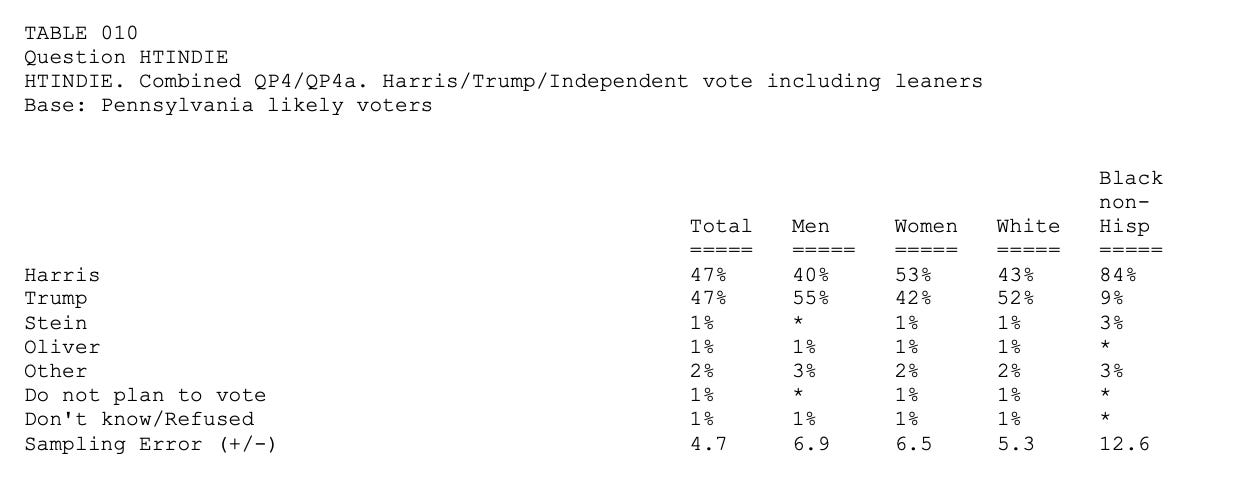 The cross-tabs indicate an enormous divide between men and women voters: Trump leads Harris by 17 points among male voters, while Harris leads Trump by 11 points among women voters.