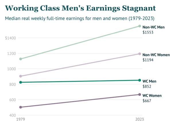 While women have seen their wages grow, especially in the white collar space, working class men have also seen their take-home pay stagnate since 1979. The shift away from manufacturing and the rise of automation has also fostered a constant precariousness that has replaced any sense of job security in the jobs that used to lift working class men into the middle class.