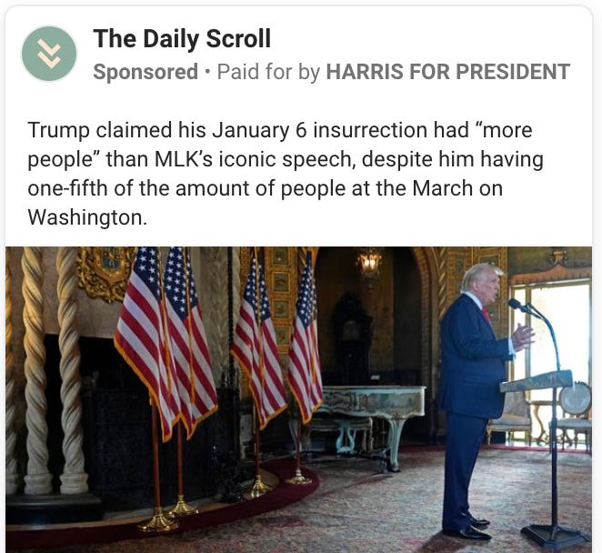 The Harris campaign has committed a record amount of money to digital advertising, and it’s done some interesting things on TikTok, but it’s Facebook and Instagram ads are simply bloodless appeals for donations, with outdated polls and vague warnings about the possibility that a campaign with no apparent convictions might lose.