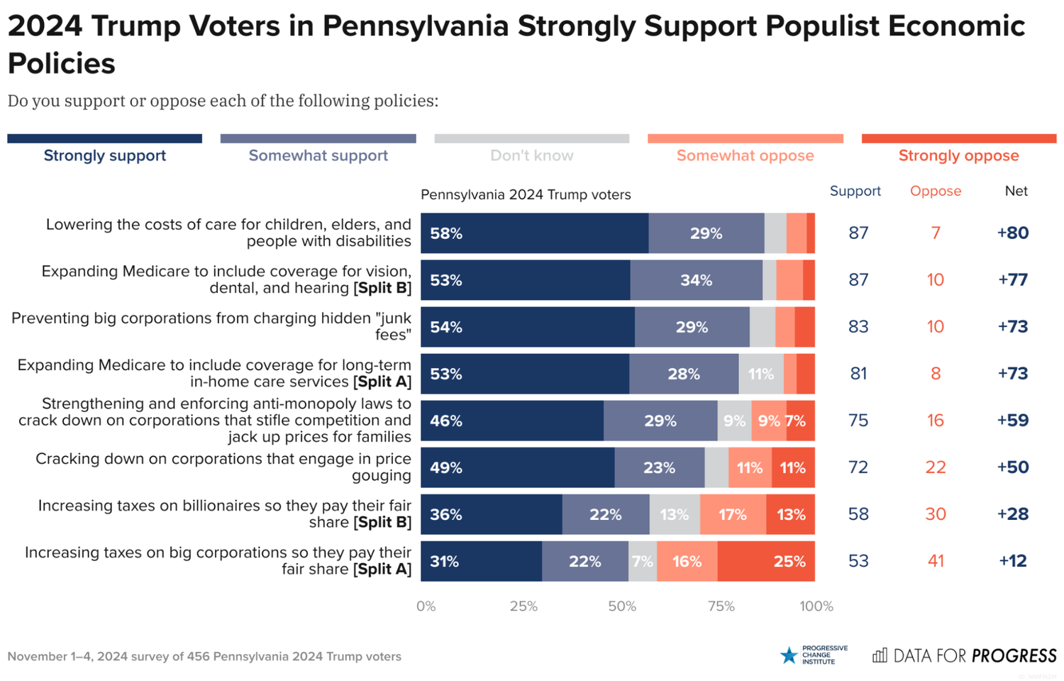To be fair, Harris did have a version of some of these policies in her platform, which was far more friendly to working people than Trump’s. But because there was no big overarching theme to her campaign other than “Trump is a dangerous jerk,” Harris lagged behind when it came to big ideas and issues. Say what you will about him — seriously, say whatever you want — but Trump enunciated his policies loud and clear.