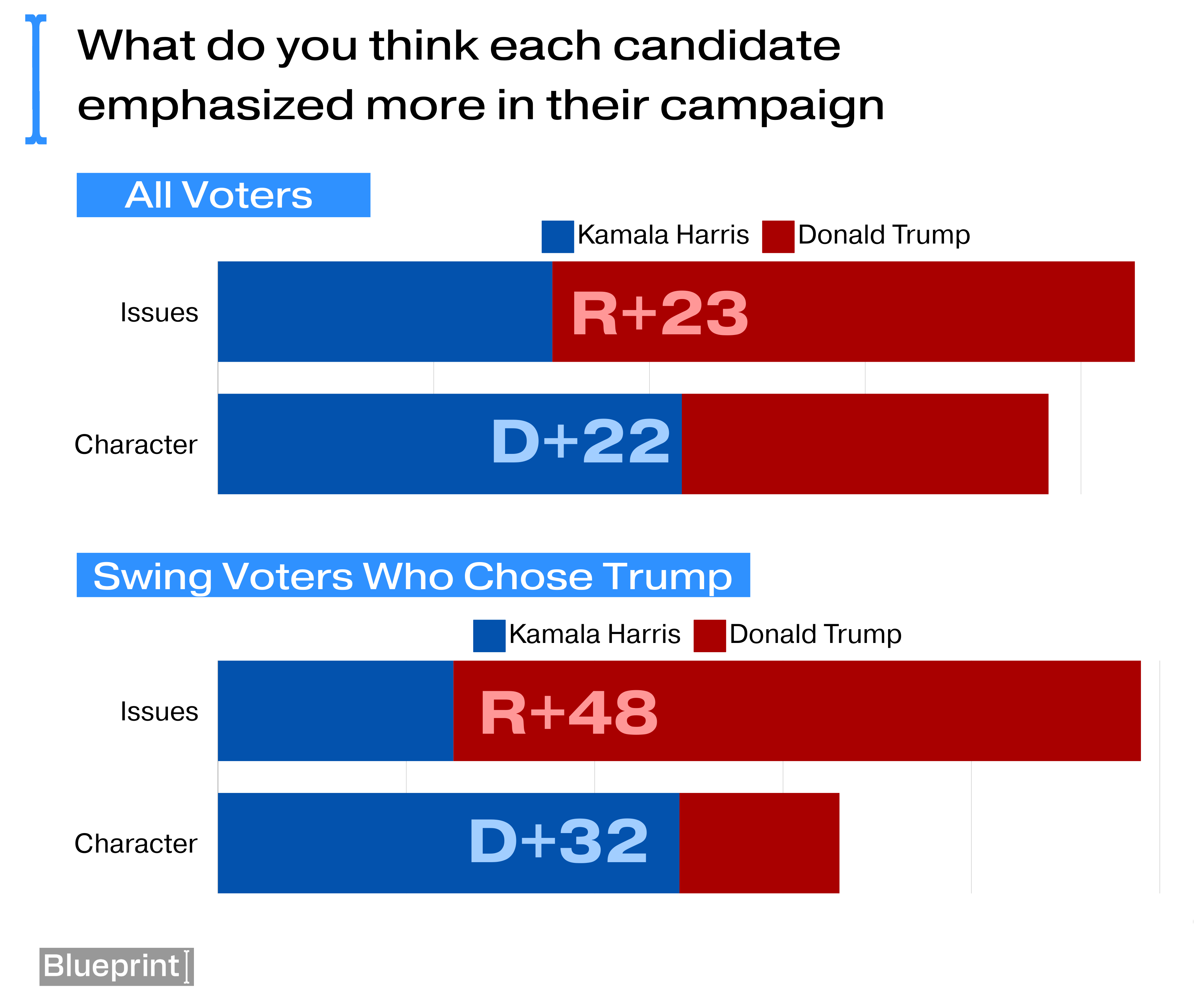 He’s always graded on a curve, but Trump’s ideas got a lot of attention in part because they were easy to understand. Things like ending taxes on tips spoke to working people in a way that tax credits and insurance coverage premiums derived from percentages of income simply did not. A new poll from Blueprint found that, irony of ironies, Trump was seen as the candidate of substance this year.