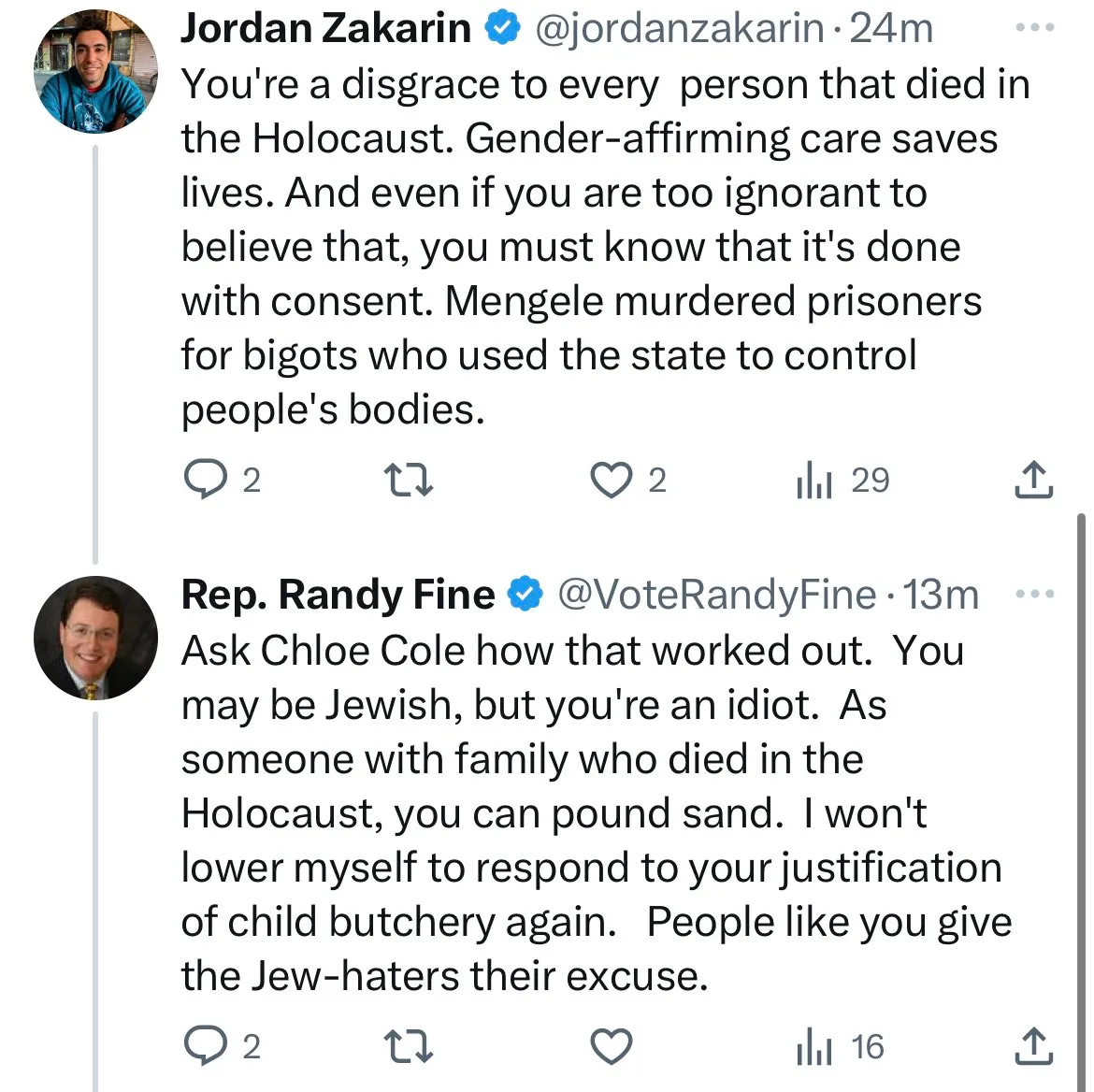 Fine is one of the nation’s leading bigots and mean-spirited trolls. He led the way in the campaign to ban gender-affirming care, likening life-saving treatment to the inhumane and deadly “experiments” that Dr. Josef Mengele inflicted on prisoners at Auschwitz.