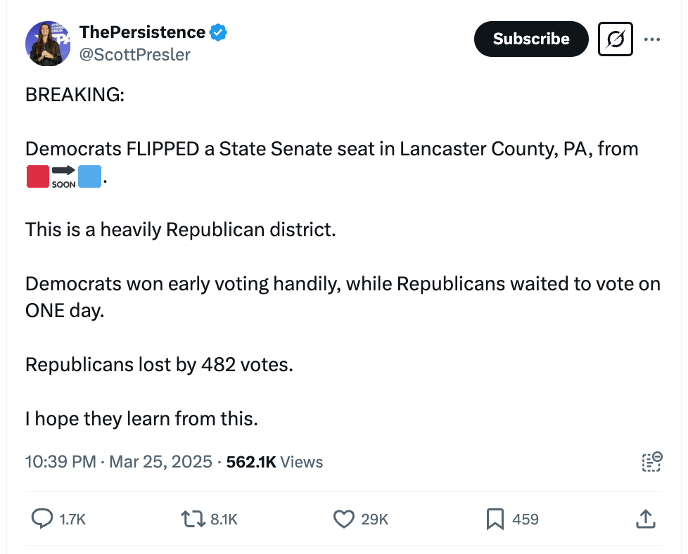 Lancaster has also been the site of concerted progressive organizing since Trump’s first victory, a surprising development in a rural area that I reported on all the way back in 2017 (here’s a piece from 2020 on how it culminated in Pennsylvania going blue in that year’s election). That energy persists, especially in the parts of the county that are more college town than conservative enclave, and especially now, when Democrats are desperate to put wins on the board anywhere. The sheer amount of focus on these small elections, both by locals and partisans across the country, can outweigh their individual importance.