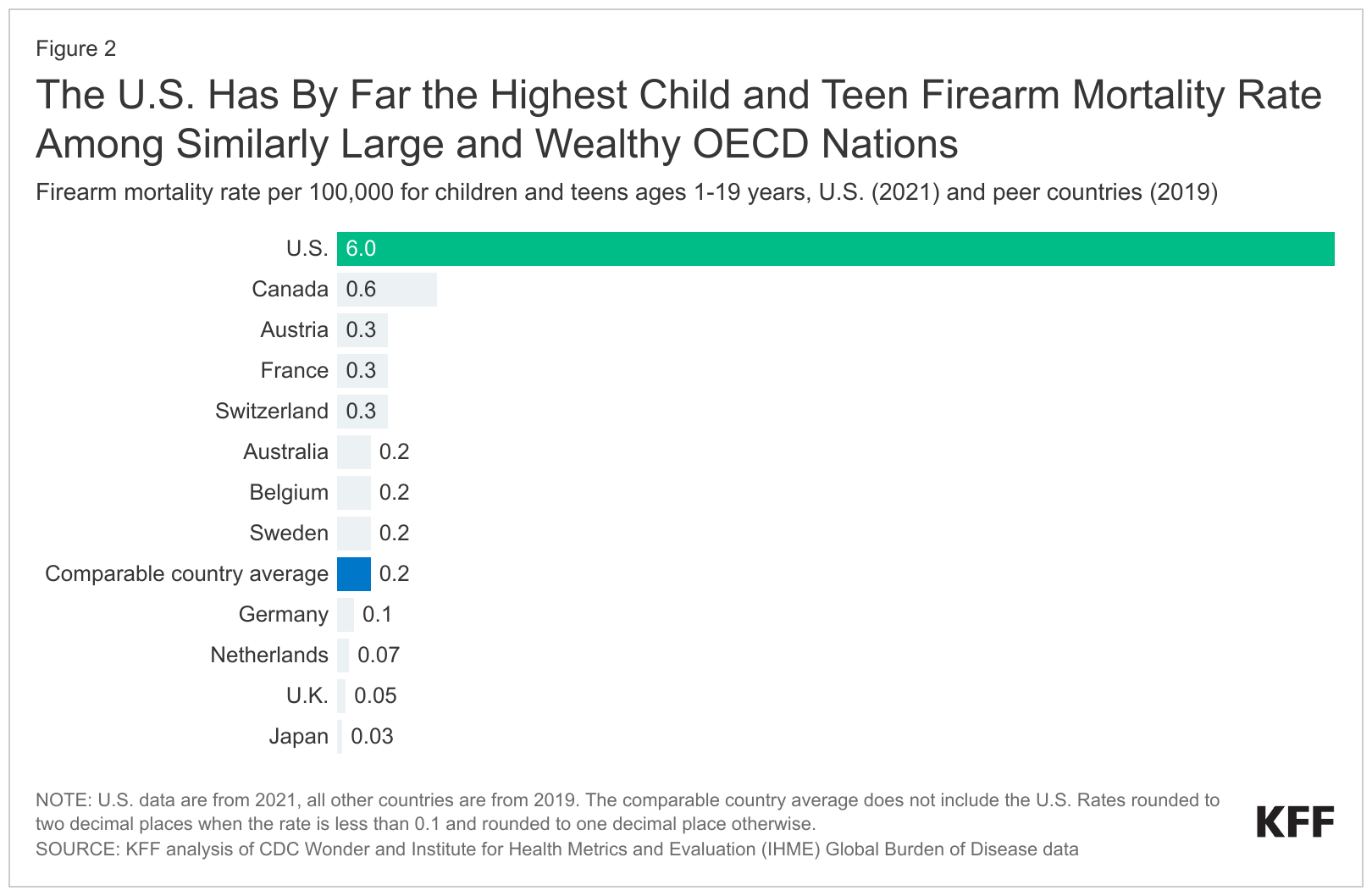 Altogether, the mortality rate reached six deaths in per 100,000 people under the age of 20. The country with the second-highest rate, Canada, clocked in at 0.6 children killed by guns per 100,000. In Europe and Asia, the numbers were even lower.