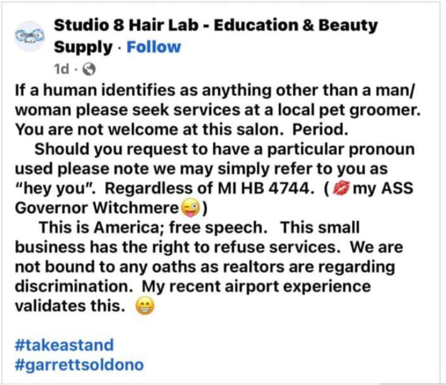 The brouhaha lasted only a few days, but the damage was done. In Traverse City, a liberal enclave within a more rural part of the state, a salon owner kicked up a storm when she posted a truly idiotic and bigoted missive on Facebook that announced that trans people would not be served at her store.