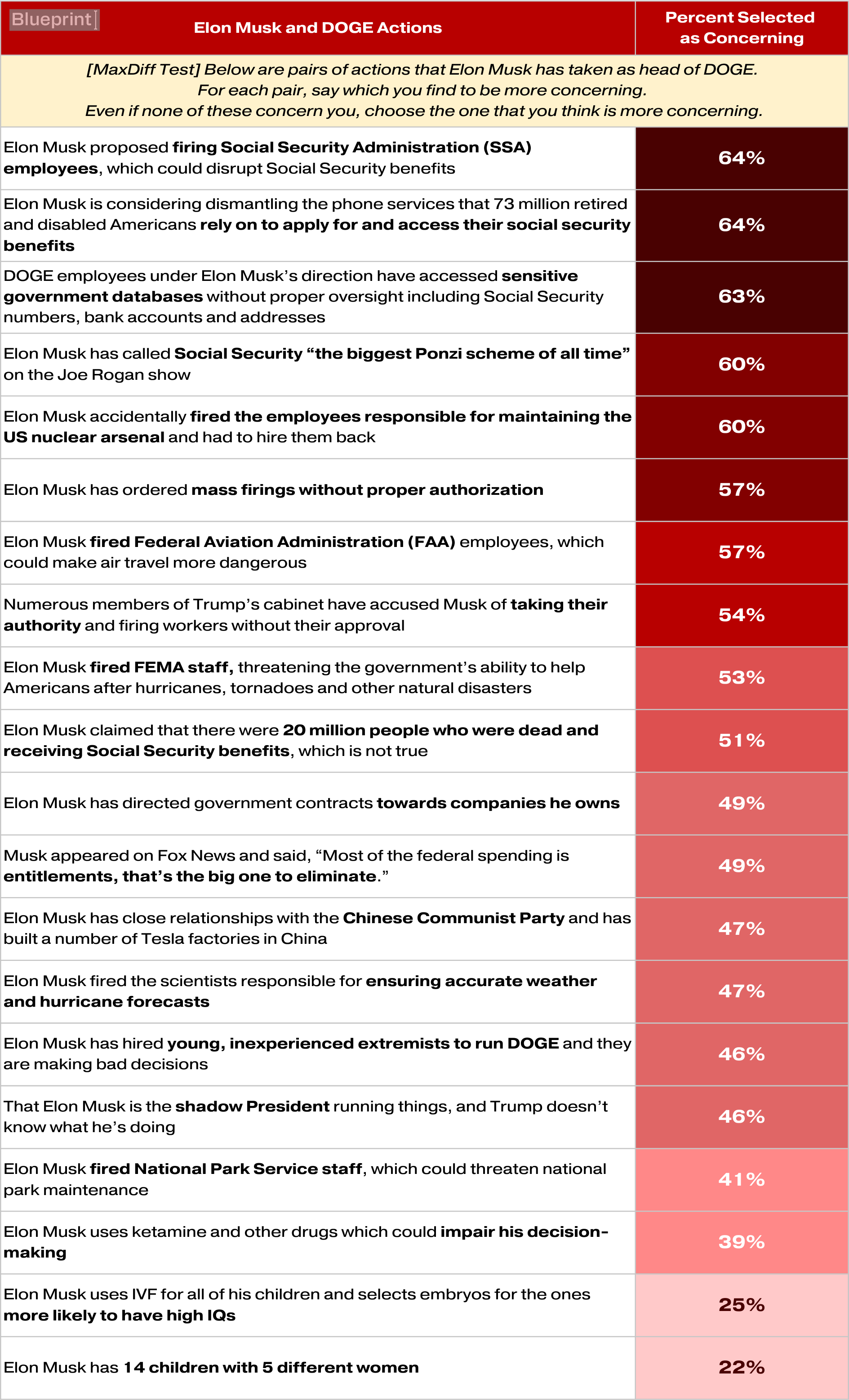 Several voters who agreed that the government needed to tighten its belt suggested that DOGE was a more of a dog and pony show than any real cost-cutting. Here’s what the firm Blueprint found when they asked people what they feared about DOGE’s defenestration of federal agencies.