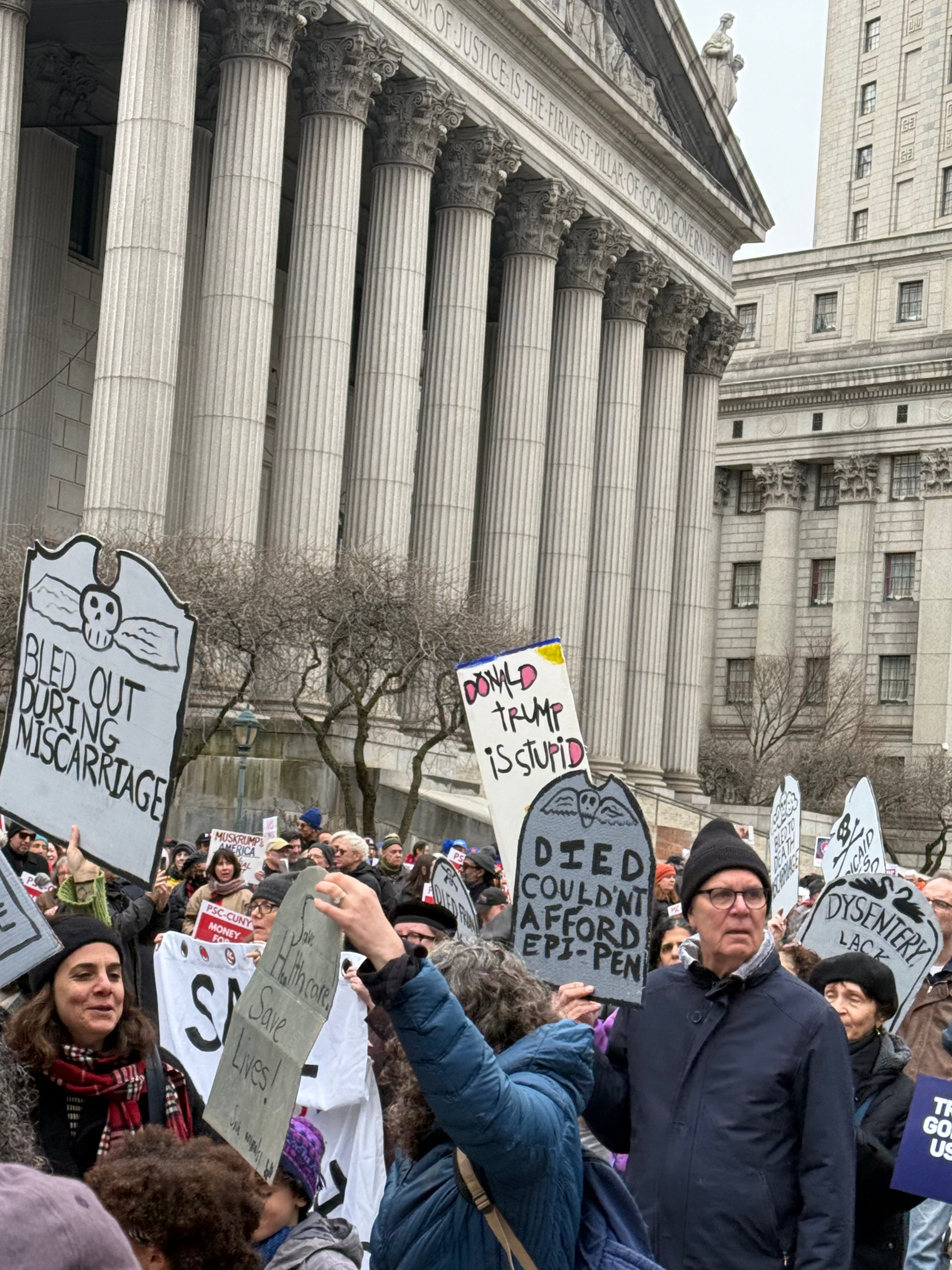 I’ve lived in New York City for half my waking life now and I still tend to get turned around and bit when I get off the subway at the southernmost points of lower Manhattan, where narrow streets and oddly shaped plazas predate the island’s grid and the old marble and limestone buildings jigsaw around modernity. I had no such trouble finding my way on Saturday morning, however, when I emerged from City Hall subway station to booming music and a procession of sign-carrying New Yorkers to guide me toward Foley Square.