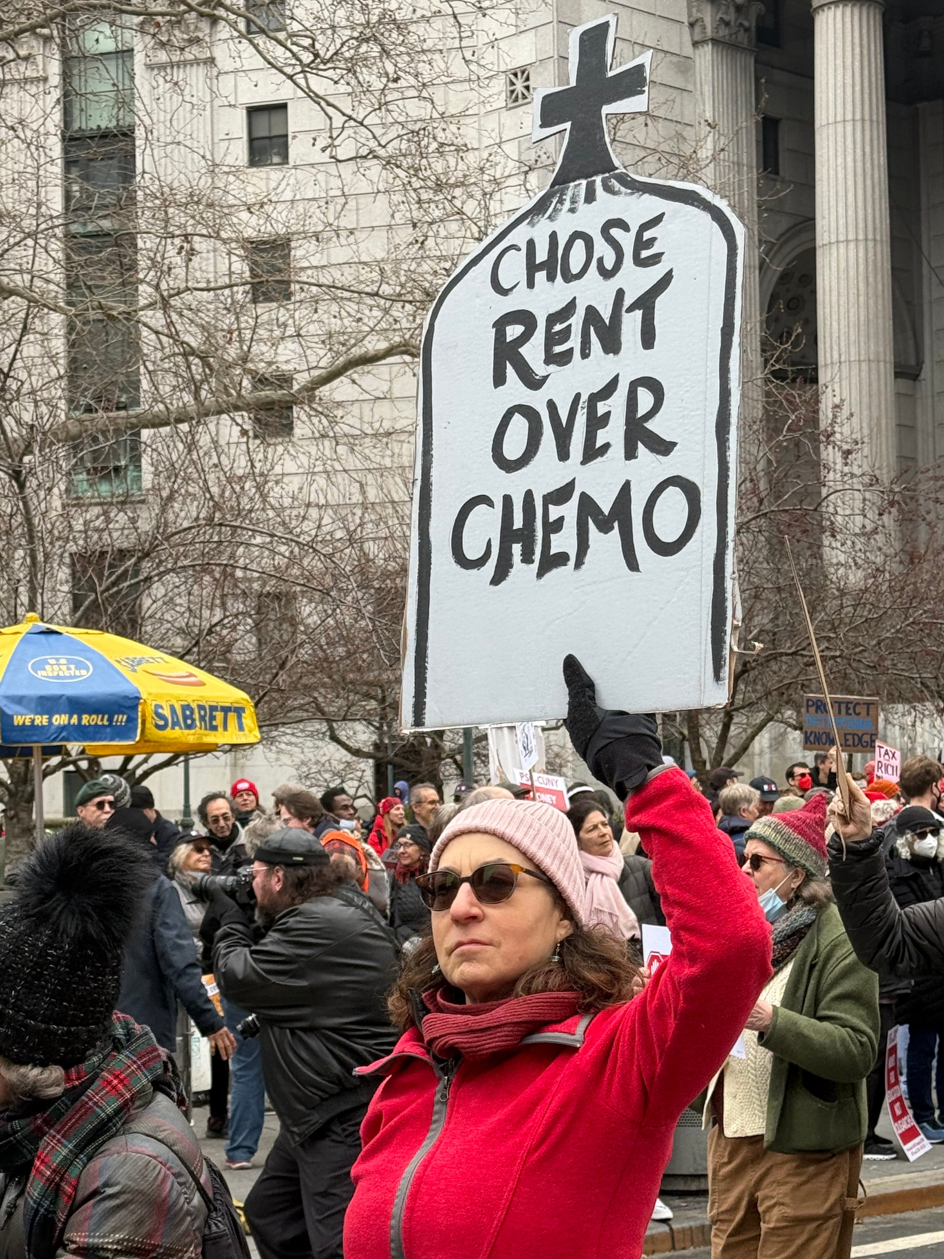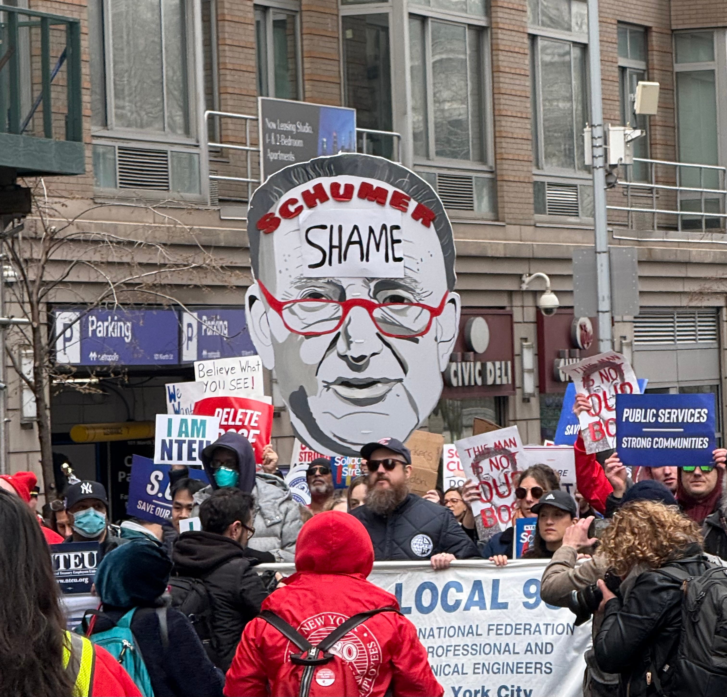 That he was a target of these protestors in particular was a retort to the justification he gave for his vote: it was organized in part by healthcare workers and Medicaid patients, who held placards that demanded that Democrats “Save Our Services,” while the long march led by federal workers, some fired and others still tenuously employed, featured a massive cutout of Schumer’s head with the word “SHAME” scrawled across his forehead.