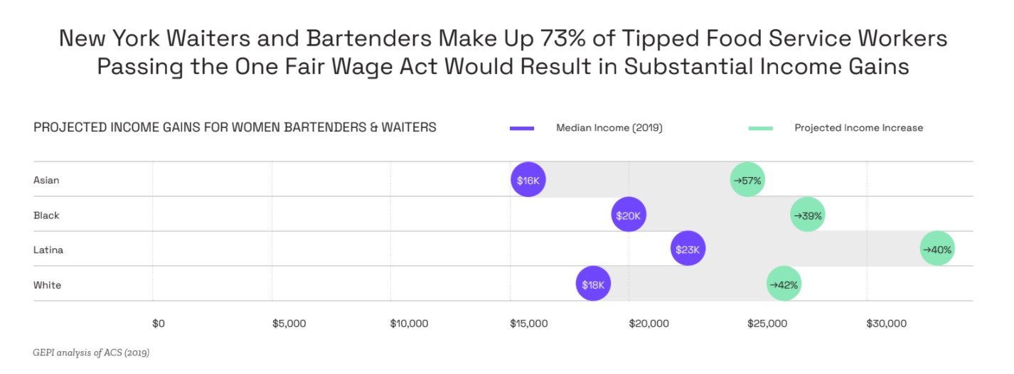 New York’s One Fair Wage Act would end the two-tier minimum wage system and bring everyone up to $15-an-hour. The impact would be dramatic — according to the Gender Policy Equity Institute, most women waiters and bartenders would have their incomes increase by more than 40%, while full-time women waiters and bartenders would experience a more than $10,000 boost. The increase on a percentage basis would be steepest for women of color, whose take-home pay would jump over $9,000.