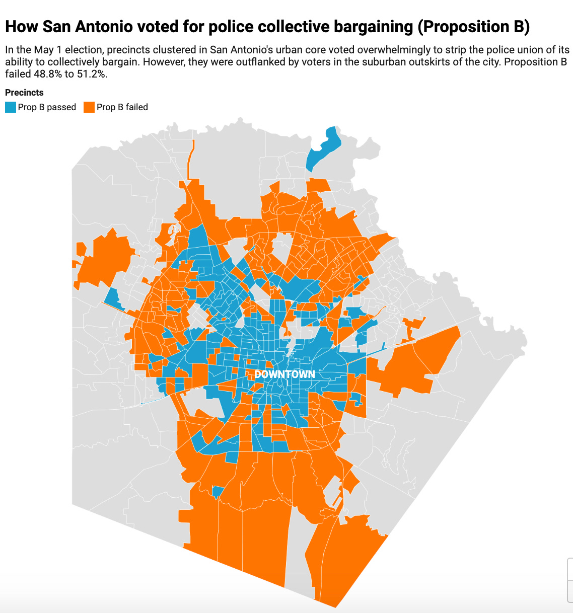 Texas: A few weeks ago, a local ballot initiative in San Antonio that would have seriously weakened police unions (and thereby create much harsher consequences for the “bad apple” cops that abuse and murder people) fell short by just a point. As you could have probably guessed, it was the wealthier voters in the more suburb-adjacent areas of the city, people far less likely to get choked to death by a police officer, who provided the votes to kill the referendum.