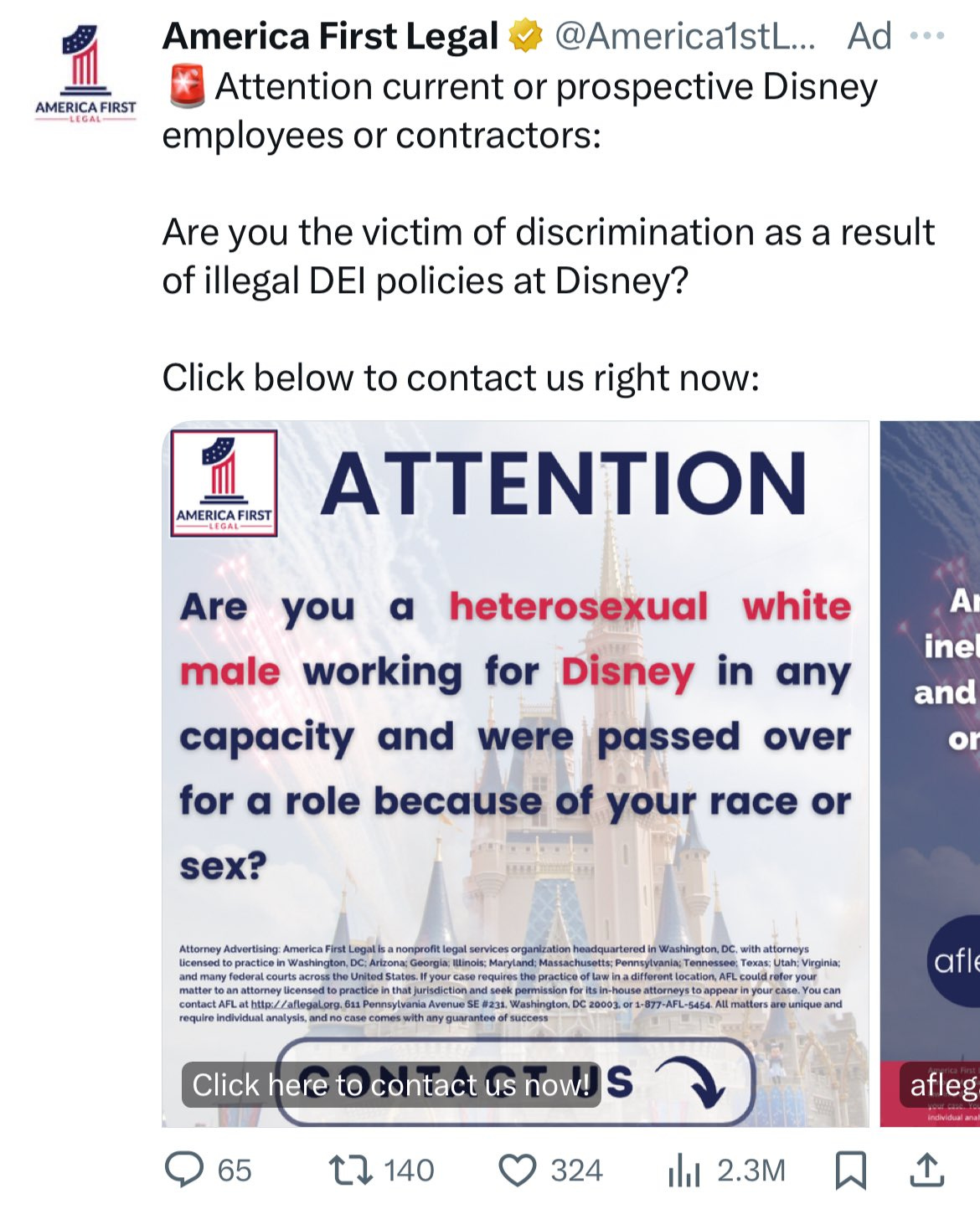 The firm uses Twitter, now teeming with groyper under the stewardship of Elon Musk, to solicit complaints from white people deluded enough to blame DEI for their failure to get hired or promoted at Disney and shameless enough to join a federal civil rights lawsuit against the company.