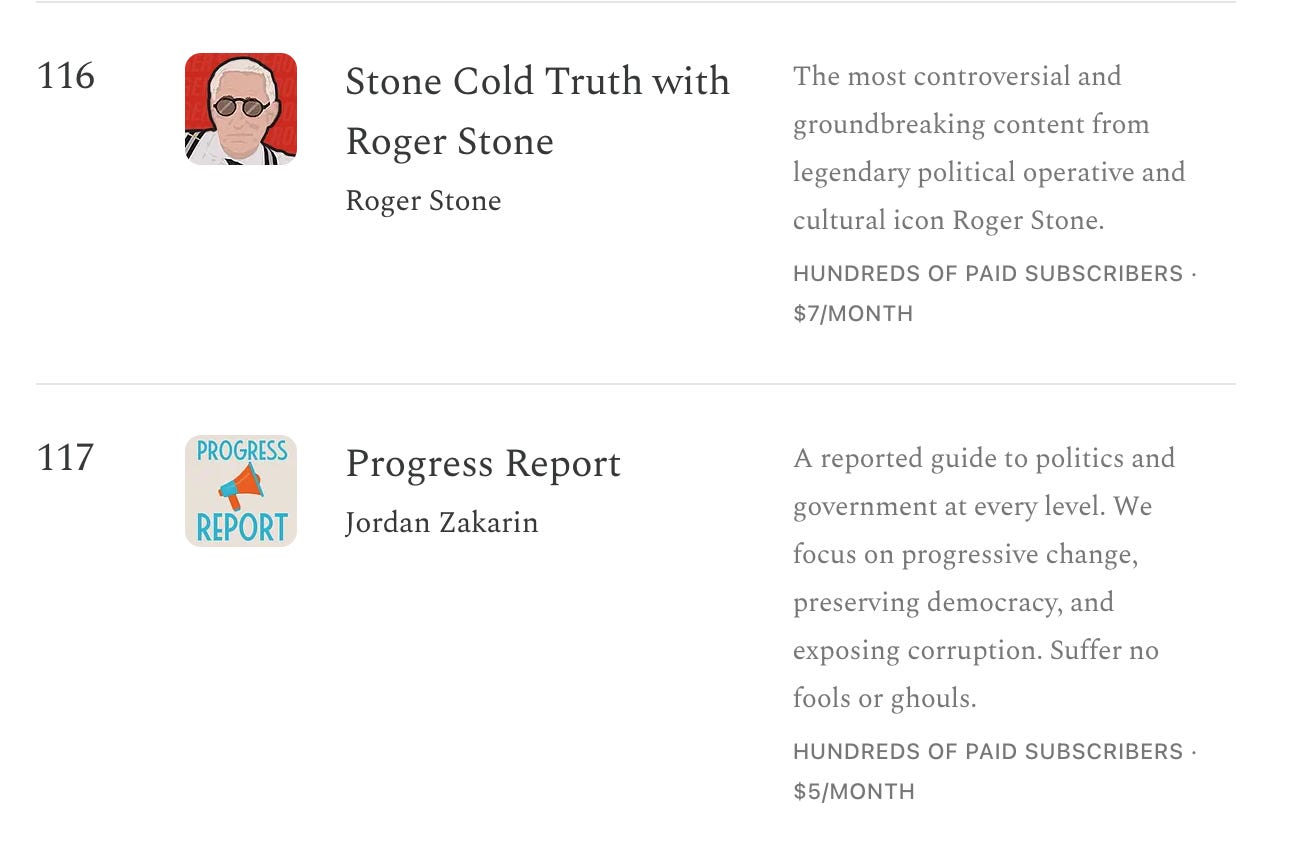 Unfortunately, we slipped a spot to #117 on the Substack charts — directly beneath Roger Stone’s newsletter. This won’t do.