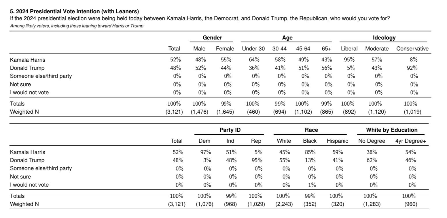 First, the demographic breakdowns look quite positive for Harris, who only trails by four points among male voters. That’s a marked improvement from August, when she trailed by nine points among men. Her lead among women fell by just one point, within the margin of error. The age breakdowns largely remained the same, though Harris did improve three points among voters ages 45-64.