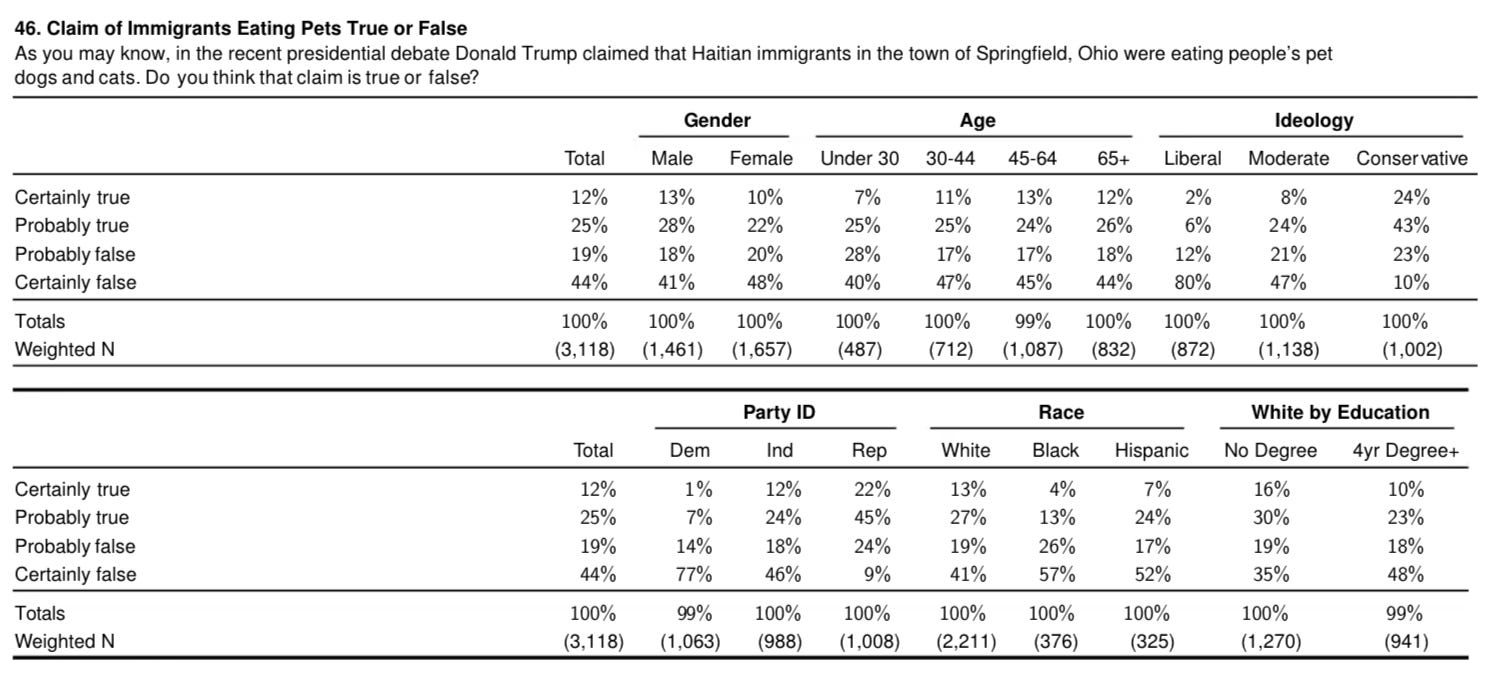 YouGov asked a load of questions about current events and specific news stories, and the most dismal results by far came in response to the horrible lie that Trump, JD Vance, and the far-right media has spread about Haitians in Springfield, OH.