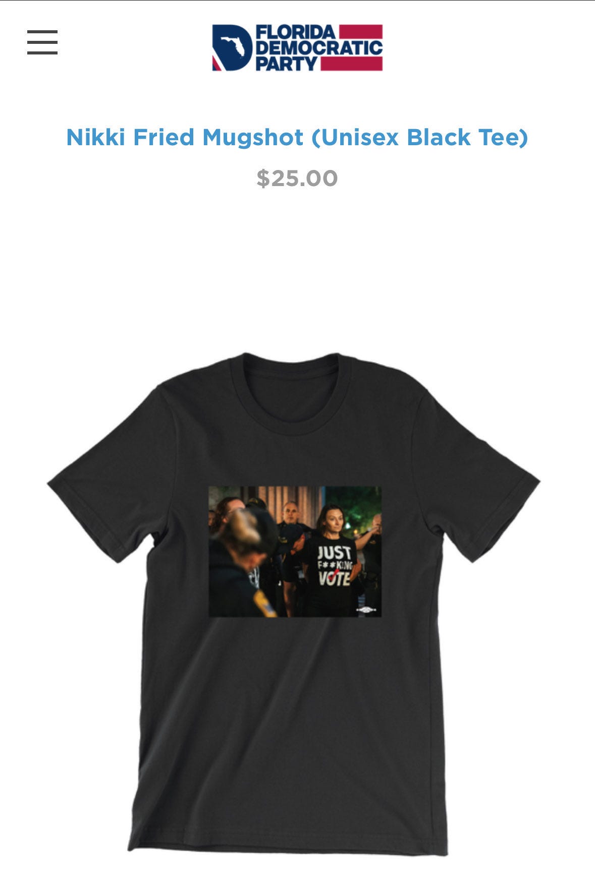 Those details weren’t included in the media coverage that followed, but Fried made sure to plaster the photo of her in cuffs everywhere, and even sell the replicas of the shirt that she wore.