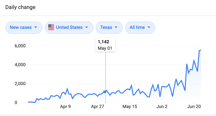 In the graph of Texas’s coronavirus cases below, I’ve marked the date at which Abbott began the state’s reopening: