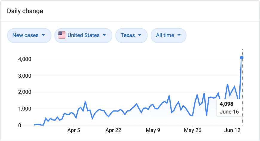 Yesterday, I noted that Arizona hit its all-time single-day high for new coronavirus infections and that infections were surging in Texas, as well. But Texas was not content to be a side note, it seems, so late last night, the state announced a dramatic increase in new COVID-19 cases that obliterated its previous record.
