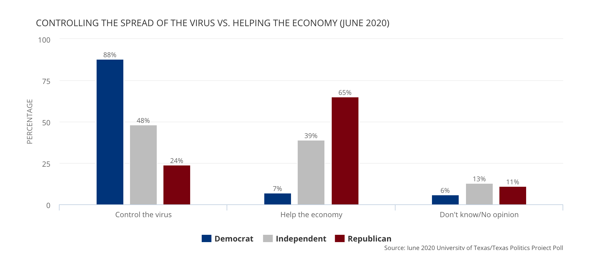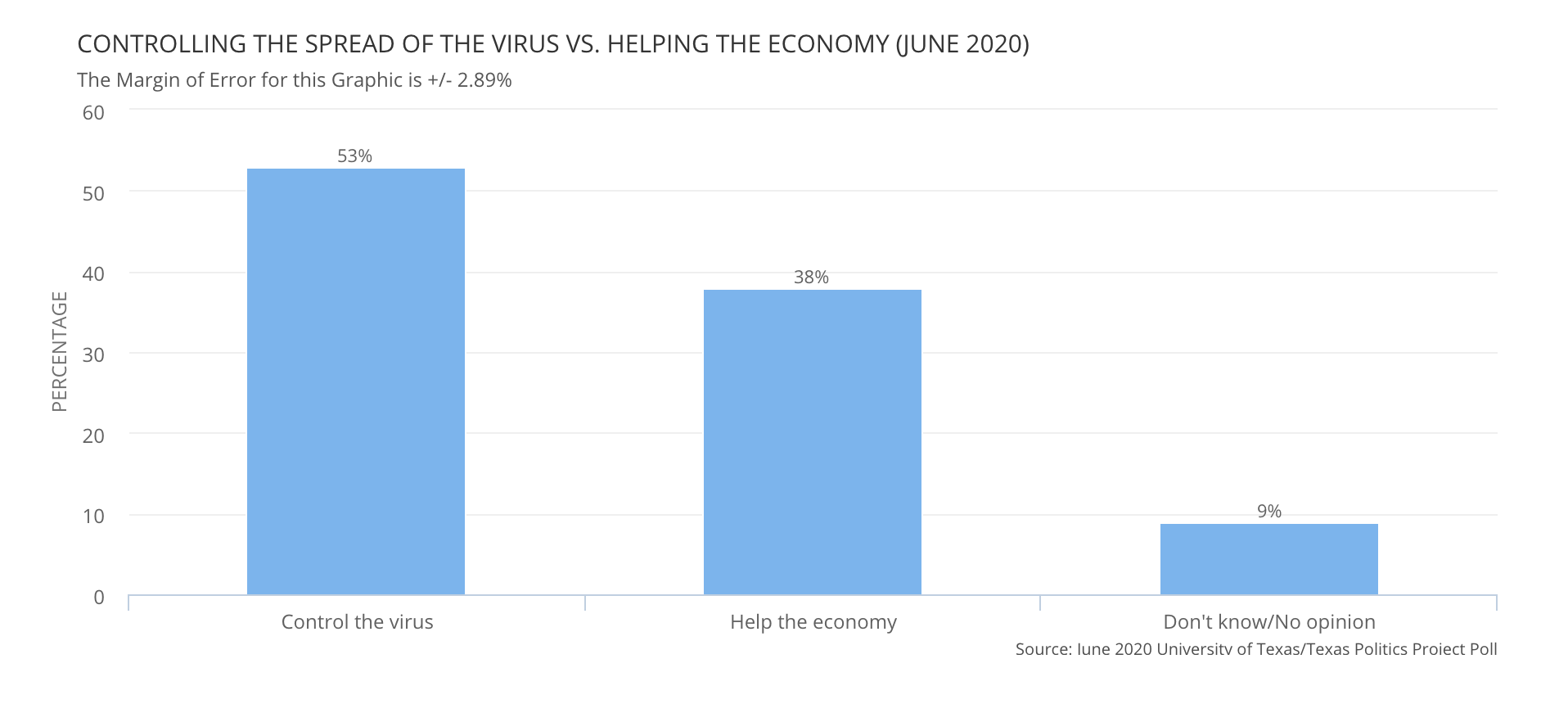 The share of Texans who say that efforts to deal with the pandemic in Texas are going badly increased sharply between April and June, from 29% to 51%, while those who said it was going well fell from 66% to 29%.
