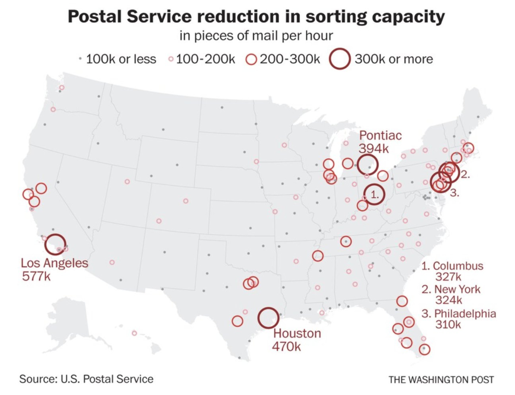 The USPS, now run by Trump booster and shipping magnate Louis DeJoy, has removed more than 500 mail sorting machines (according to the Washington Post, it’s a whopping 671!) from postal facilities across the country. Should the USPS successfully remove all of the machines it’s targeting, it will slow mail delivery even more than it’s already been slowed by budget cuts, the end of overtime, and new USPS policy. The postal service, surprise surprise, is lying about their justifications, saying that mail has slowed down (which isn’t the case at all! It’s a pandemic!).