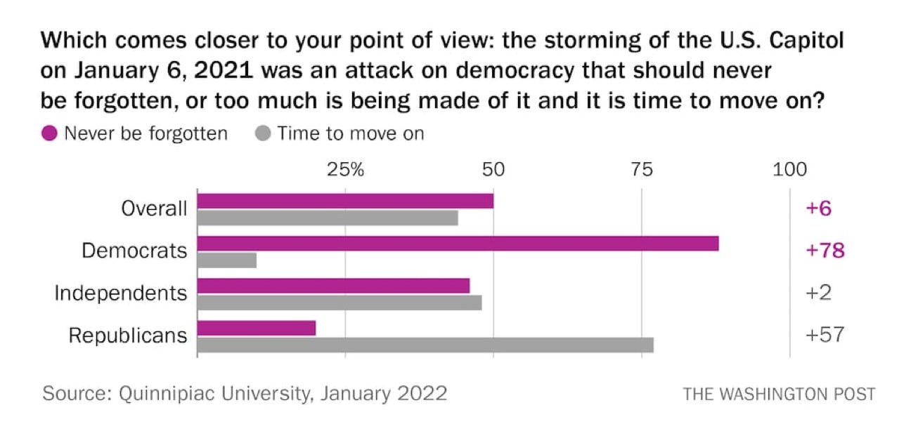 This is not pessimism, just a clear-eyed reading of data and understanding of historic precedent. While there was a general consensus in the immediate aftermath of the insurrection that it was inappropriate for Republican leaders to assist thousands of dead-enders to furiously storm the Capitol in an attempt to seize power over the American government, public opinion has since largely bifurcated along the typical partisan breakdown.