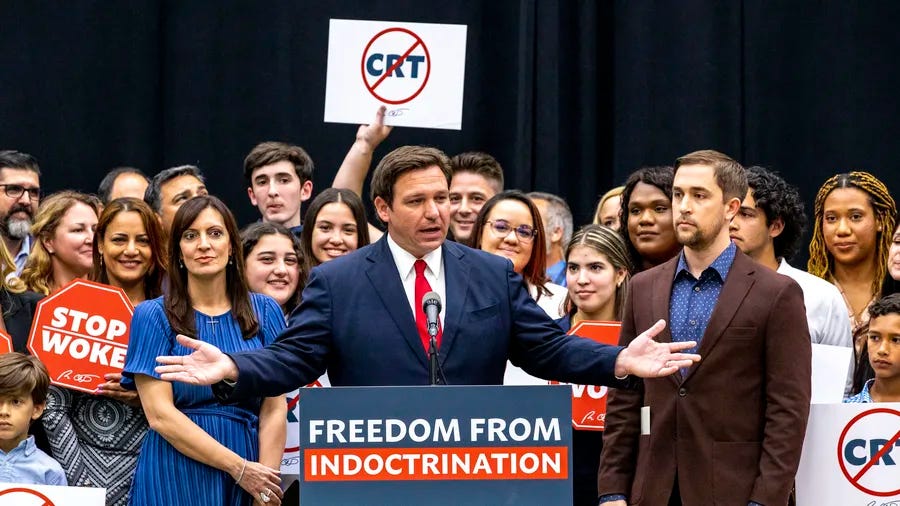 Rufo’s targeted hate speech and fountain of bigoted misinformation has led to the far-right fixation on accusing gay teachers of being “groomers” and delirious book bans in schools and libraries nationwide. He’s been transparent with his strategy, which has nonetheless worked countless numbskull parents into a froth against gay teachers, drag queens, and Disney alike. Republicans have followed his playbook to devastating effect, and none more so than DeSantis.