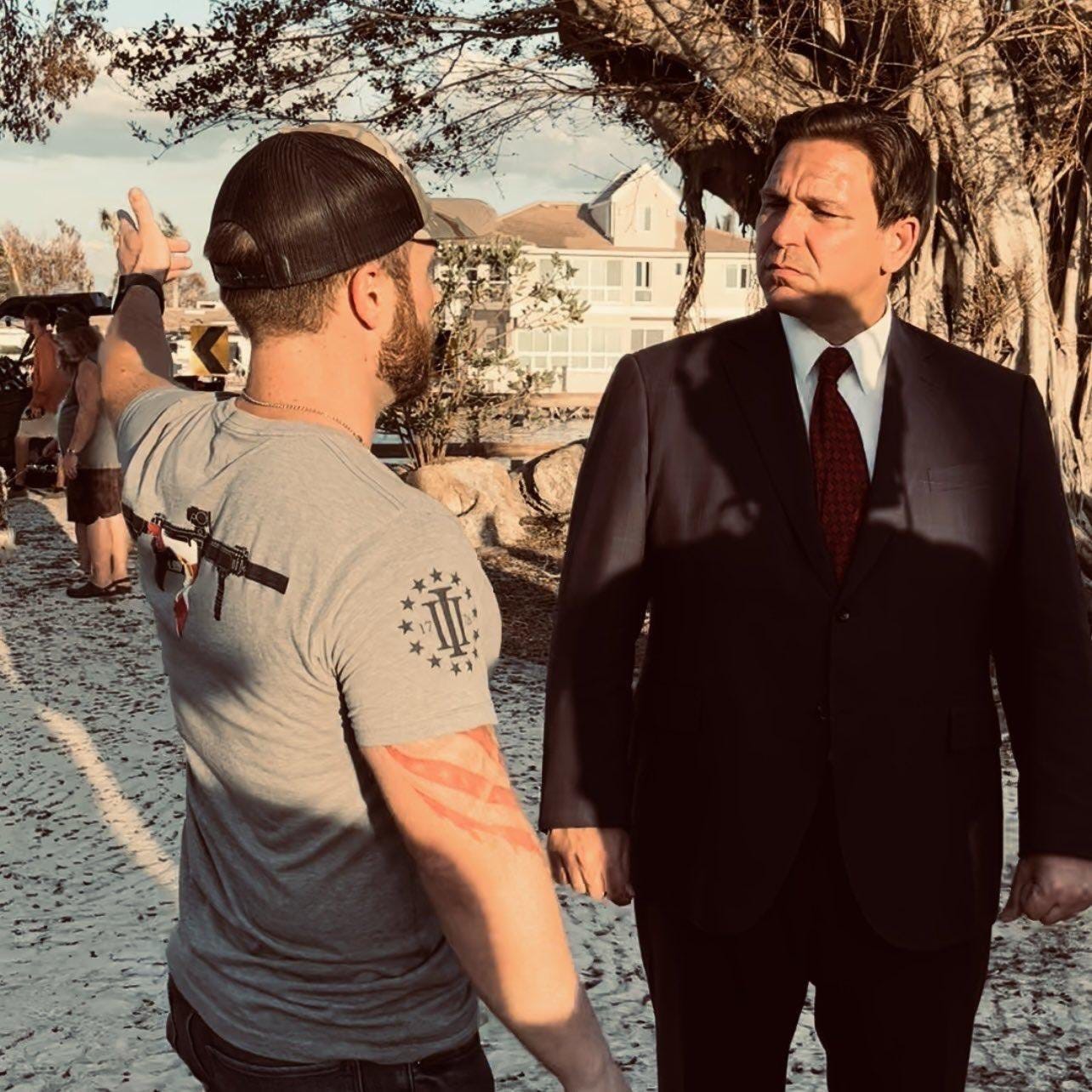 Ron DeSantis will not speak to the national media, but continues to give preferential treatment and access to violent insurrectionists. He can’t pretend to be ignorant of their ties, either. After Hurricane Ian devastated Southwest Florida, Leslie was given an exclusive interview with Ron Desantis while wearing the insignia of the Three Percenters, a far-right militia.