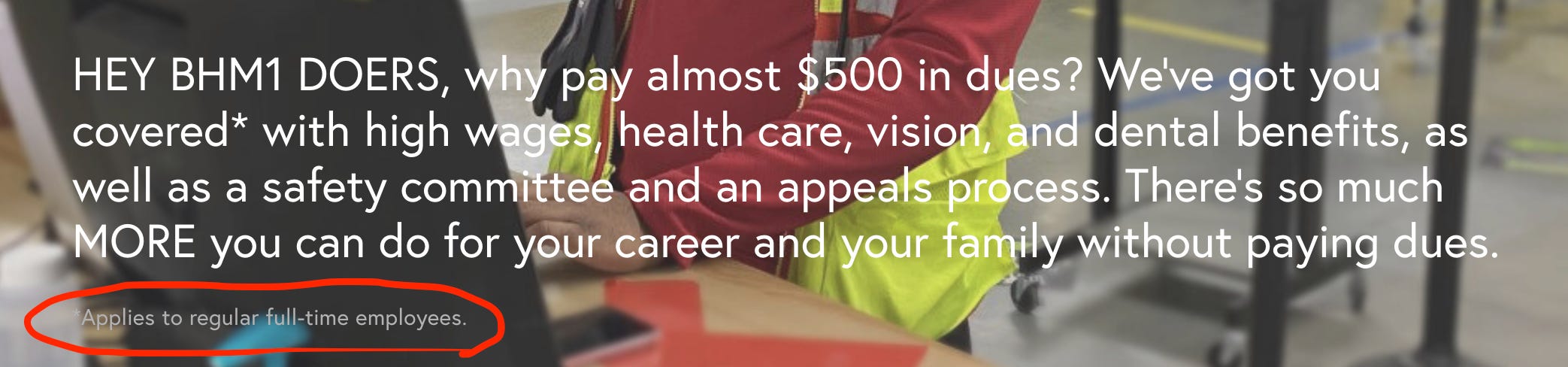 The company is doing everything it can to mislead workers into thinking that a union would be bad for them. It recently set up this pitiful website that is chockful of misinformation, including this asterisk found right in the first paragraph: