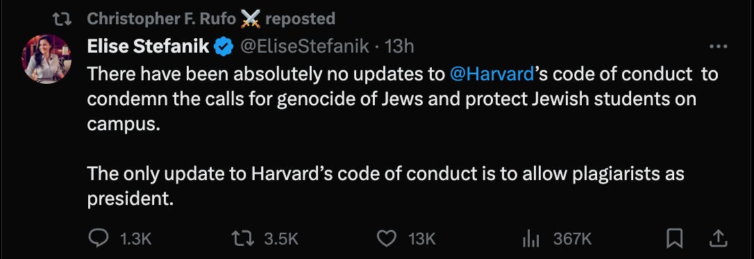 The right’s conspiracy hive mind has been obsessed for the past few days with allegations that Gay included plagiarized passages in her doctoral dissertation and some of her academic papers. The allegation was first made public by Christopher Rufo, a pseudo-intellectual who used to bully homeless people before transitioning to being the white nationalist weenie progenitor of CRT panic and Ron DeSantis’s sidekick.