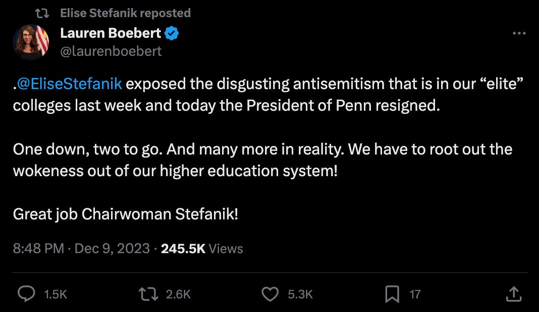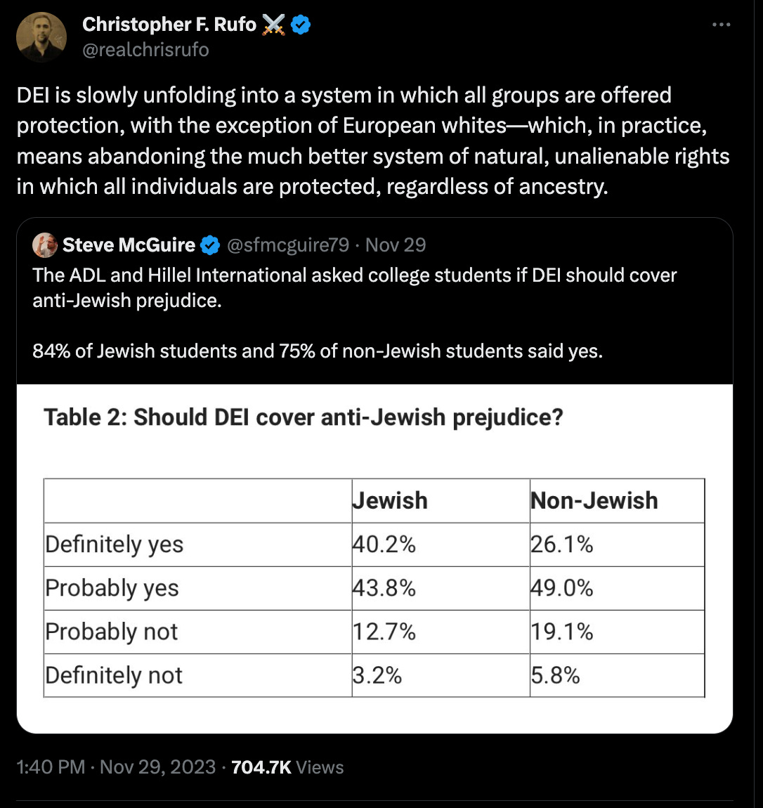 In a mind-numbing series of tweets on Tuesday, Rufo blamed the decision not to fire Gay on campus diversity, equity, and inclusion initiatives, which have been his prime obsession this year. To be fair, Rufo has been less outspoken on the antisemitism issue, but that’s largely because he’s antisemitic…