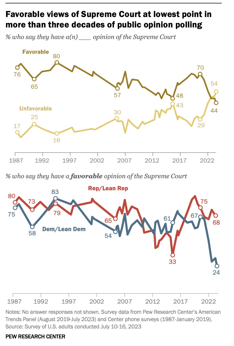 In October, a Marquette University poll found that just 43% of Americans approved of the Supreme Court’s performance, while 57% signaled disapproval. In July, a poll conducted by Pew found approval at 44%, the lowest in the company’s history. This is unprecedented stuff, and instead of feeling forced to simply accept the court’s decisions, more Americans than ever view it as a tarnished body in need of significant reform and fundamental changes.