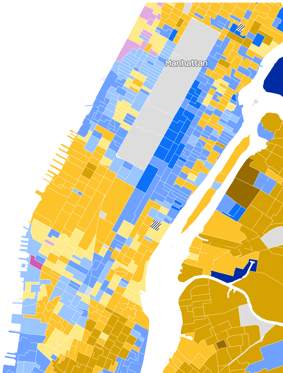 The mayoral primary provides a decent proxy for geographic ideology: a plurality of voters in both the Upper East Side and Upper West Side ranked Andrew Cuomo at the top of their mayoral primary ballots, as did East Midtown, parts of the Lower East Side, and the wealthy edges of the West Village. Zohran Mamdani was strong in places where the rent is cheaper and voters are younger, including Hell’s Kitchen, Midtown West, the East Village, and Murray Hill.