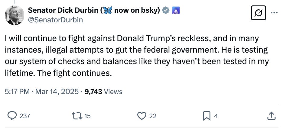 Longtime readers of this newsletter know how crazy I’m driven by Illinois’s pathetic doormat of a senior senator, who did everything possible to allow the right-wing Supreme Court justices to get away with their vast corruption scheme short of cutting them a check himself. Terminally institutionalist, he took the coward’s way out again, announcing at the last minute that he’d be voting for the GOP continuing resolution to fund the government.
