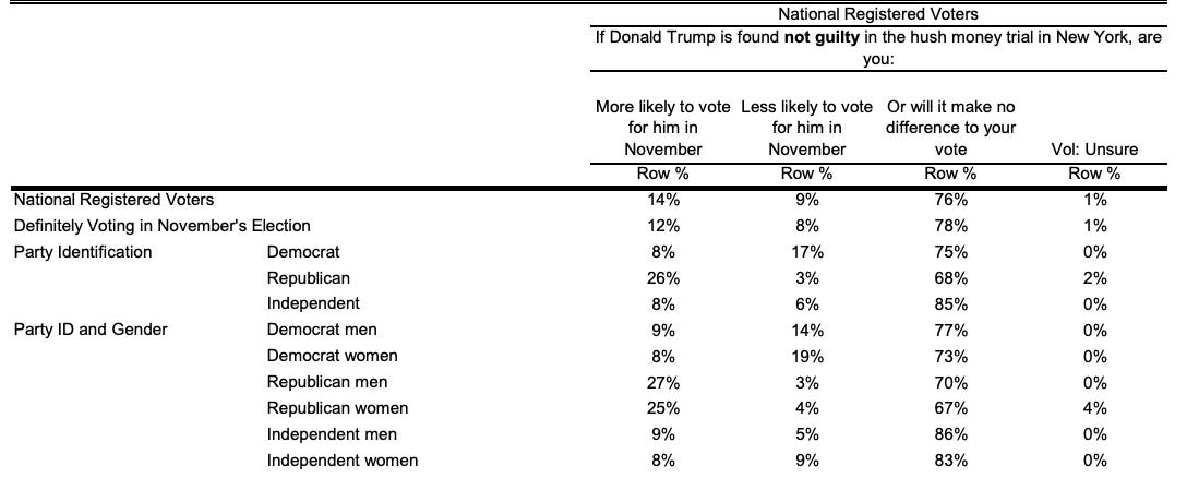 Hi, a little confused. The screenshot of the poll shows the percentage of voters likely to vote for Trump if he is found *not guilty*. But you assert that this poll shows the opposite: "Whereas previous studies suggested that a guilty verdict may break some Republicans’ resolve around Trump, a new Marist poll found that a *conviction* would make 26% of Republicans more likely to vote for him and just 3% less inclined to do so. Independents were split on the issue."