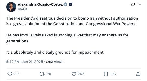 Reactions from Democrats have fallen largely along ideological lines, from John Fetterman’s broken brain cheering on the military operation (imagine surviving a near-death experience and emerging from it so callous about mass murder of civilians) to condemnations from more progressive lawmakers. Unfortunately, the most common response has been focused on process instead of the moral hazard of killing countless people in a half-assed war on behalf of a madman who has spent the past 20 months waging a genocide elsewhere in the rgion.
