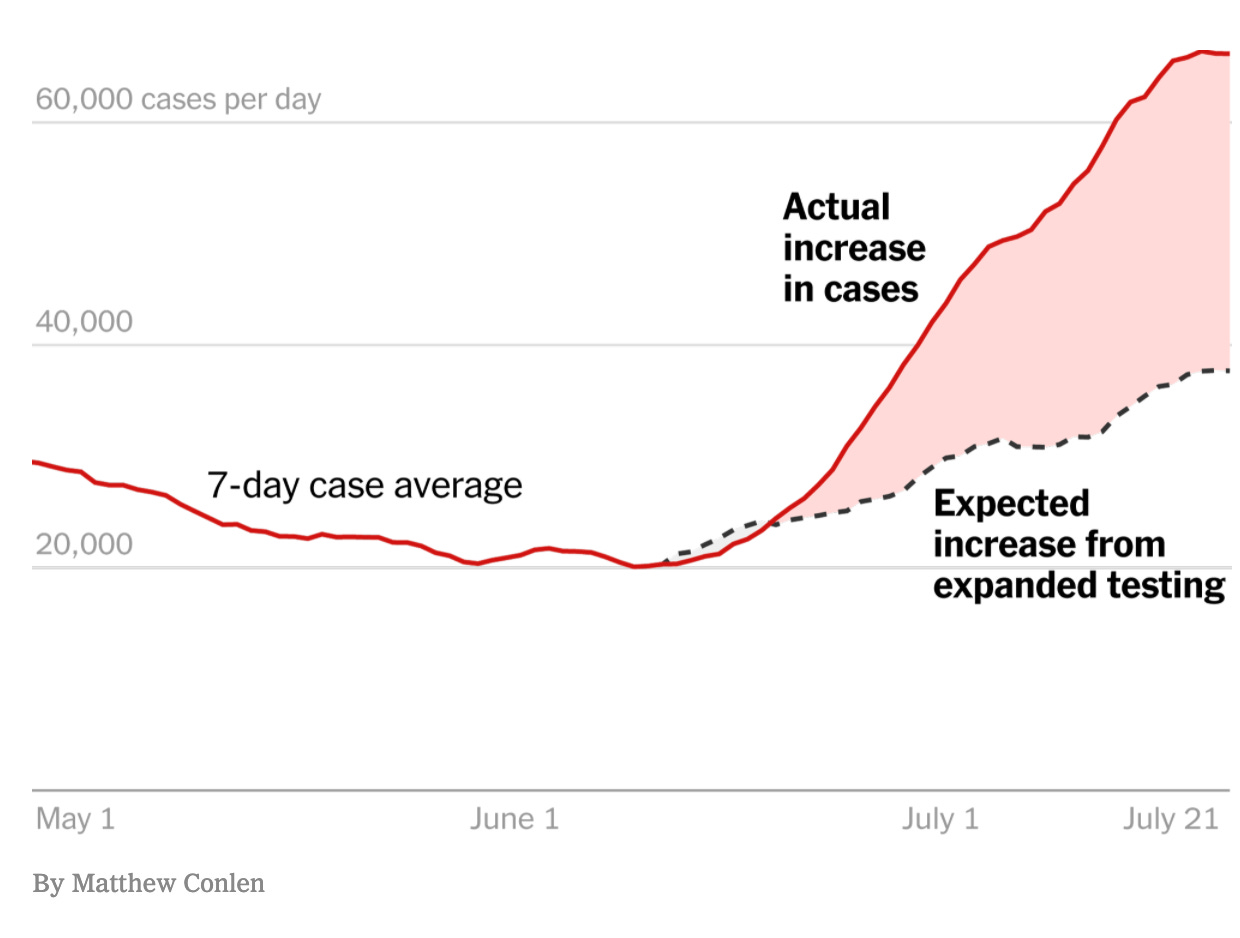 Despite what President Trump and conservative media figures blather on about, the spike in cases has nothing to do with the increase in testing, as you can see below (graph via the NY Times):