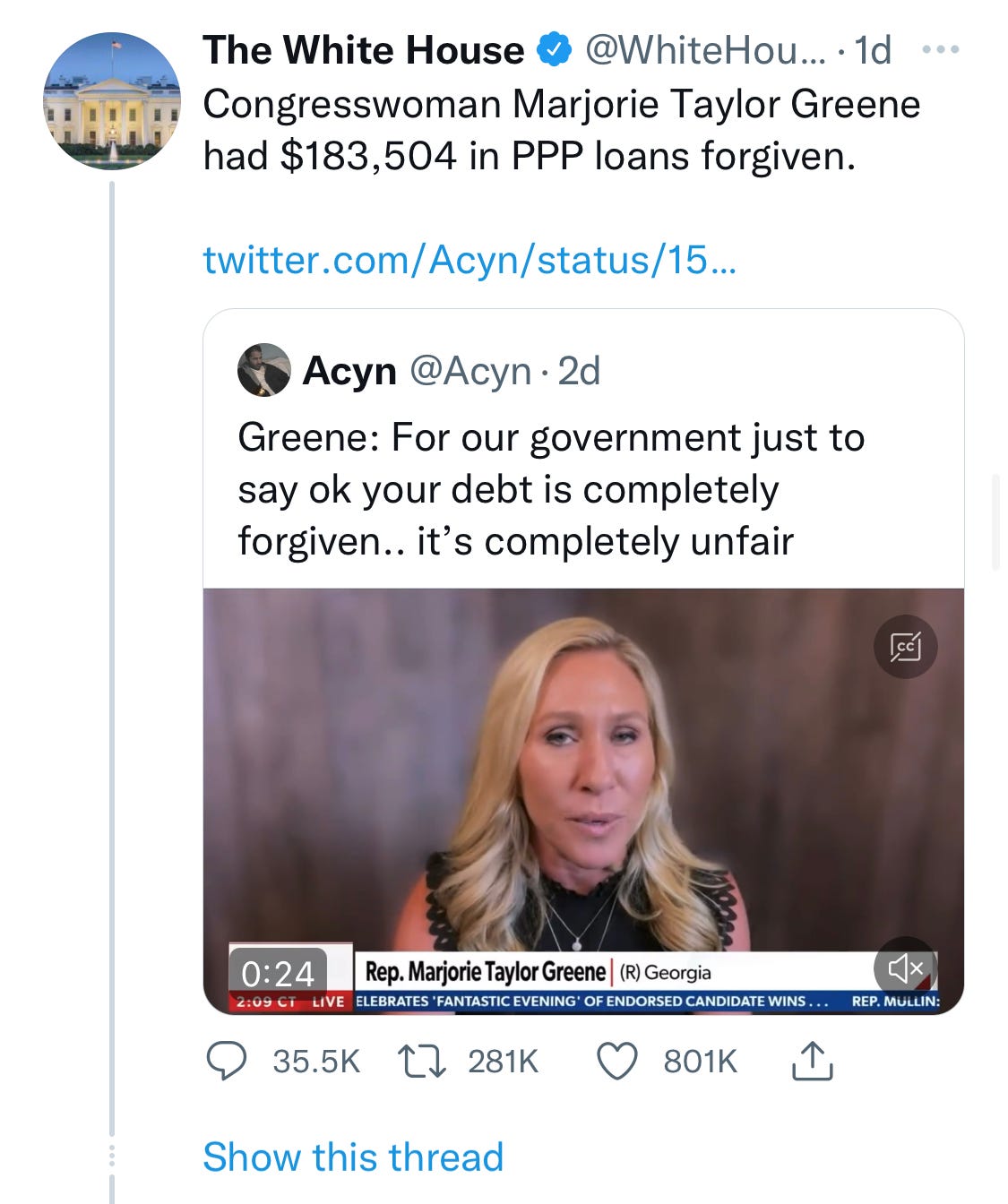 The criticism was predictable enough, as cynical Republicans railed against their go-to cultural war straw men and moaned about elites being provided government handouts for studying gender ideology at their socialist college campuses. The twist came when the administration decided to break from its customary defensive crouch and higher ground approach. Instead, the White House unleashed a Twitter thread that highlighted the six- and seven-figure government loans that were given to ghoulish Republican politicians during the pandemic and then wiped away just last year.